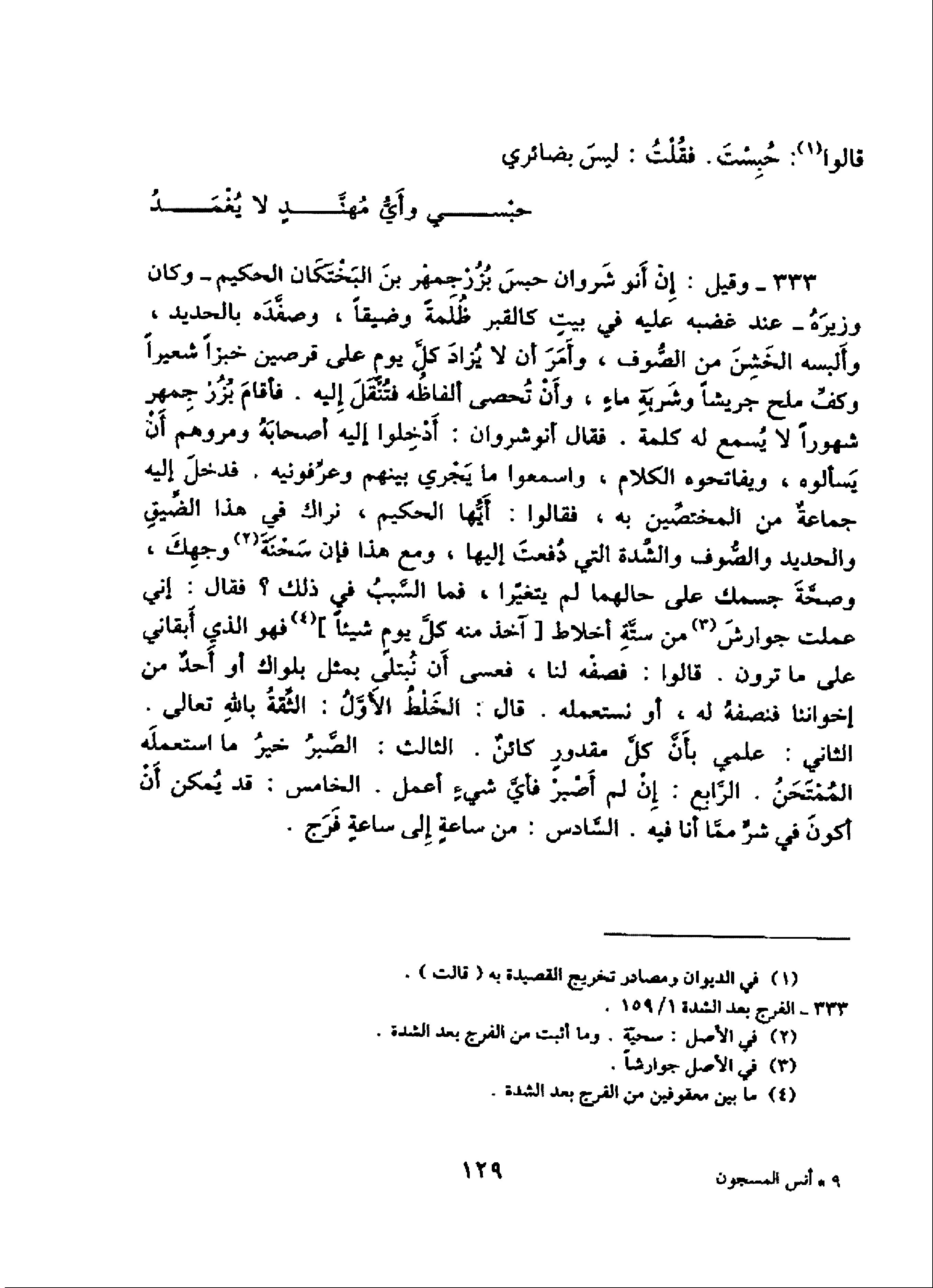 333 - وقيل: إنّ أنو شروان حبس بزرجمهر بن البختكان الحكيم-وكان وزيره-عند غضبه عليه في بيت كالقبر ظلمة وضيقا، وصفّده بالحديد، وألبسه الخشن من الصّوف، وأمر أن لا يزاد كلّ يوم على قرصين خبزا شعيرا وكفّ ملح جريشا وشربة ماء، وأن تحصى ألفاظه فتنقل إليه. فأقام بزرجمهر شهورا لا يسمع له كلمة. فقال أنوشروان: أدخلوا إليه أصحابه ومروهم أن يسألوه، ويفاتحوه الكلام، واسمعوا ما يجري بينهم وعرّفونيه. فدخل إليه جماعة من المختصّين به، فقالوا: أيّها الحكيم، نراك في هذا الضّيق والحديد والصّوف والشّدة التي دفعت إليها، ومع هذا فإن سحنة (¬2) وجهك، وصحّة جسمك على حالهما لم يتغيّرا، فما السّبب في ذلك؟ فقال: إني عملت جوارش (¬3) من ستّة أخلاط [آخذ منه كلّ يوم شيئا] (¬4) فهو الذي أبقاني على ما ترون. قالوا: فصفه لنا، فعسى أن نبتلى بمثل بلواك أو أحد من إخواننا فنصفه له، أو نستعمله. قال: الخلط الأوّل: الثّقة بالله تعالى.