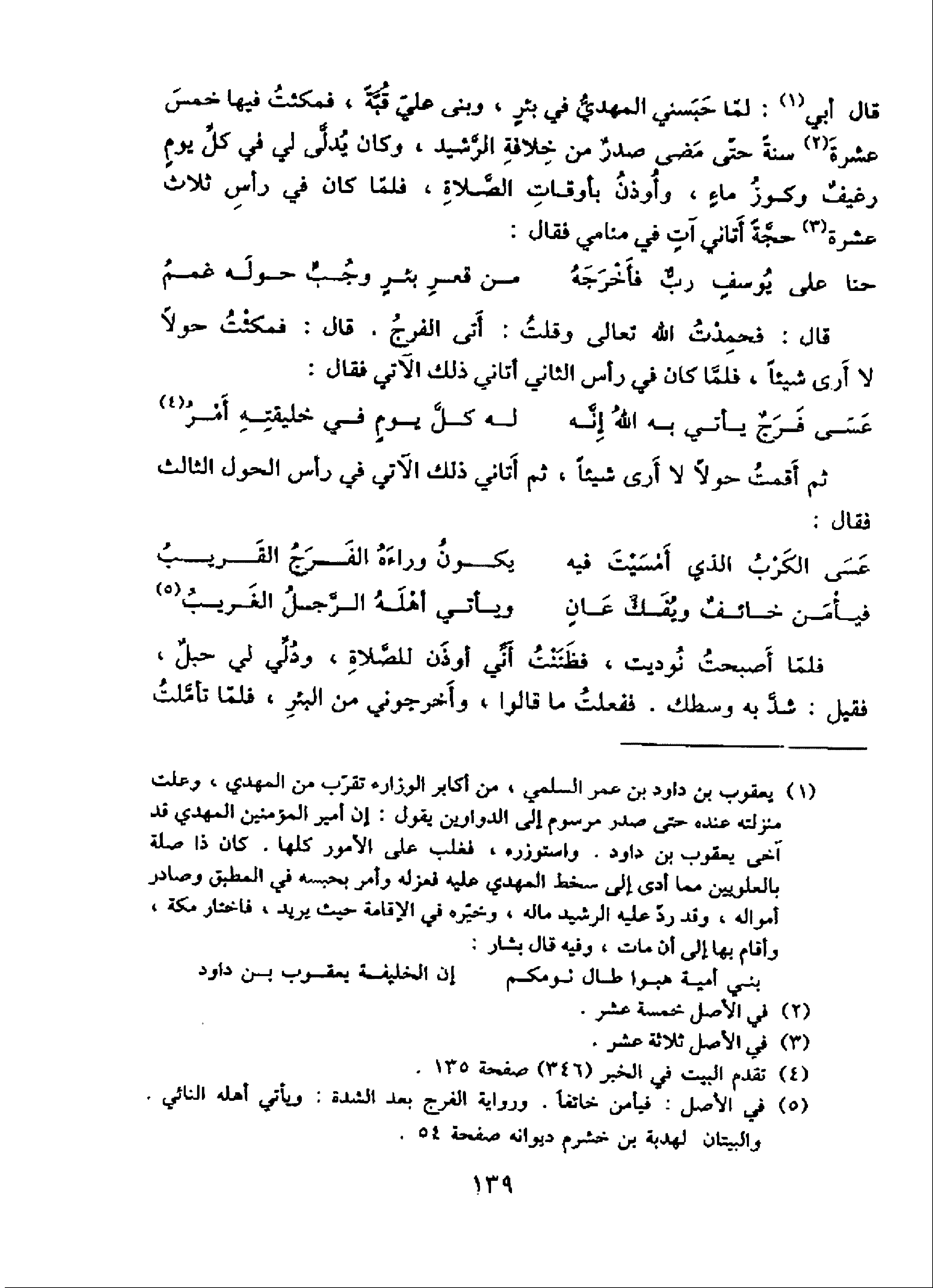 قال أبي (¬1): لمّا حبسني المهديّ في بئر، وبنى عليّ قبّة، فمكثت فيها خمس عشرة (¬2) سنة حتّى مضى صدر من خلافة الرّشيد، وكان يدلّى لي في كلّ يوم رغيف وكوز ماء، وأوذن بأوقات الصّلاة، فلمّا كان في رأس ثلاث عشرة (¬3) حجّة أتاني آت في منامي فقال: