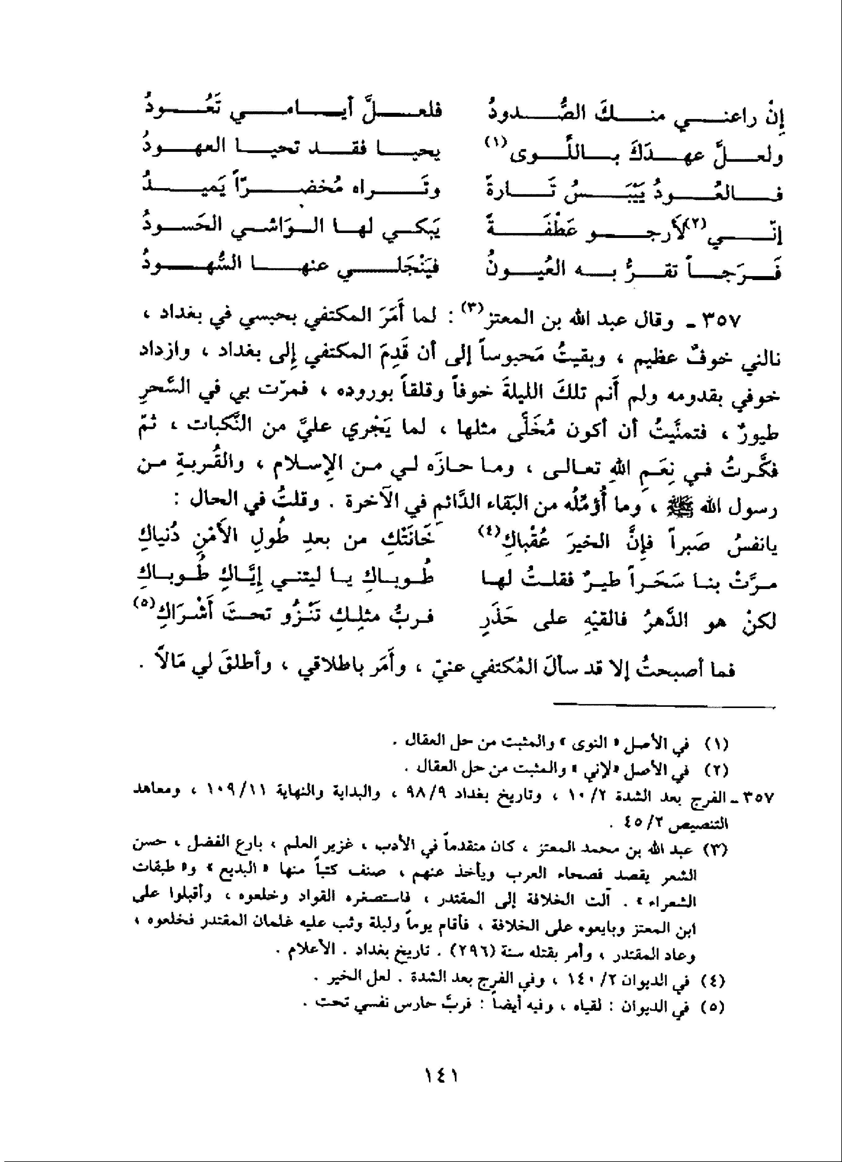 357 - وقال عبد الله بن المعتز (¬3): لما أمر المكتفي بحبسي في بغداد، نالني خوف عظيم، وبقيت محبوسا إلى أن قدم المكتفي إلى بغداد، وازداد خوفي بقدومه ولم أنم تلك الليلة خوفا وقلقا بوروده، فمرّت بي في السّحر طيور، فتمنّيت أن أكون مخلّى مثلها، لما يجري عليّ من النّكبات، ثمّ فكّرت في نعم الله تعالى، وما حازه لي من الإسلام، والقربة من رسول الله صلّى الله عليه وسلّم، وما أؤمّله من البقاء الدّائم في الآخرة. وقلت في الحال: