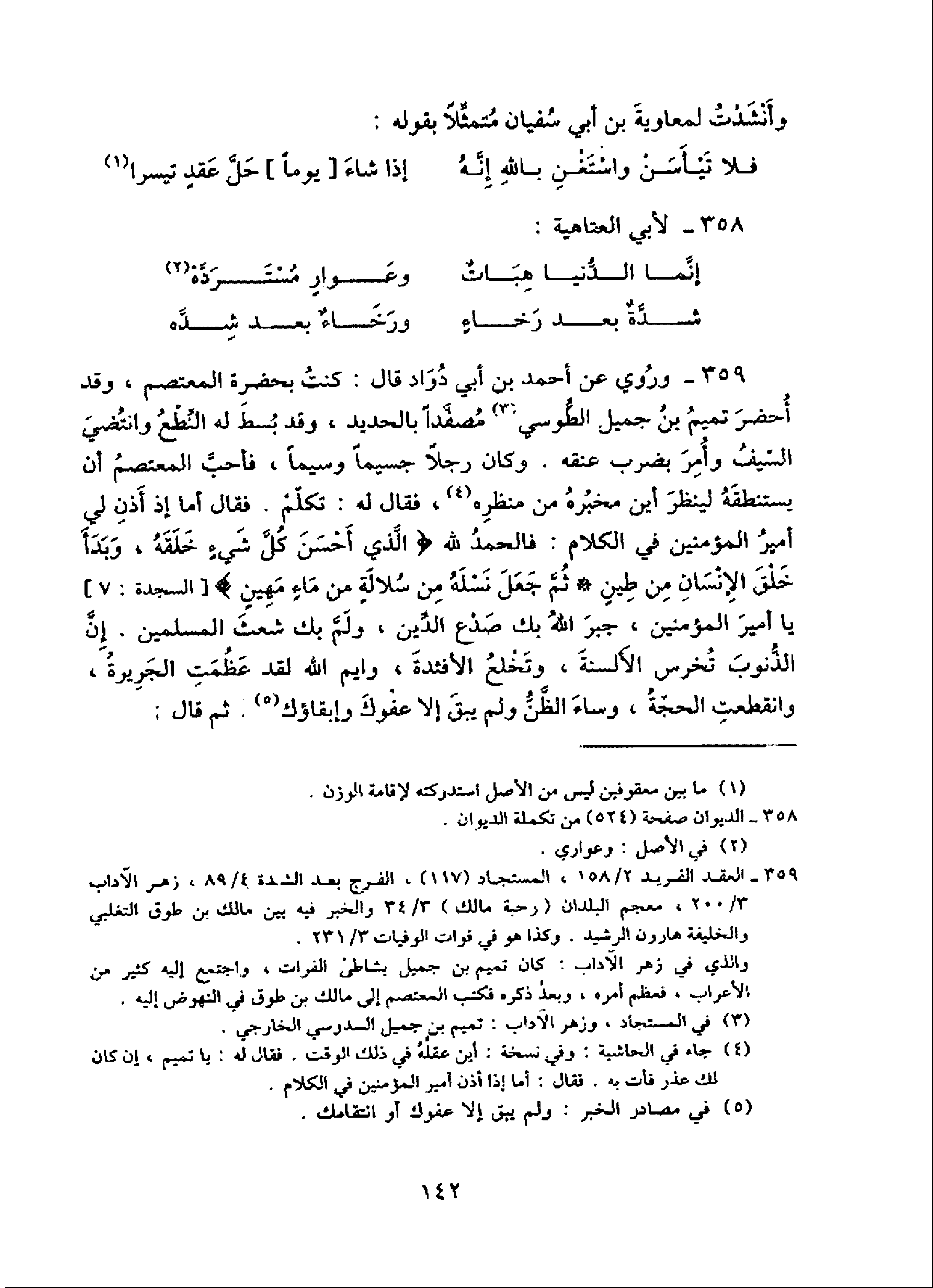 359 - العقد الفريد 2/ 158، المستجاد (117)، الفرج بعد الشدة 4/ 89، زهر الآداب 3/ 200، معجم البلدان (رحبة مالك) 3/ 34 والخبر فيه بين مالك بن طوق التغلبي والخليفة هارون الرشيد. وكذا هو في فوات الوفيات 3/ 231. والذي في زهر الآداب: كان تميم بن جميل بشاطئ الفرات، واجتمع إليه كثير من الأعراب، فعظم أمره، وبعد ذكره فكتب المعتصم إلى مالك بن طوق في النهوض إليه.