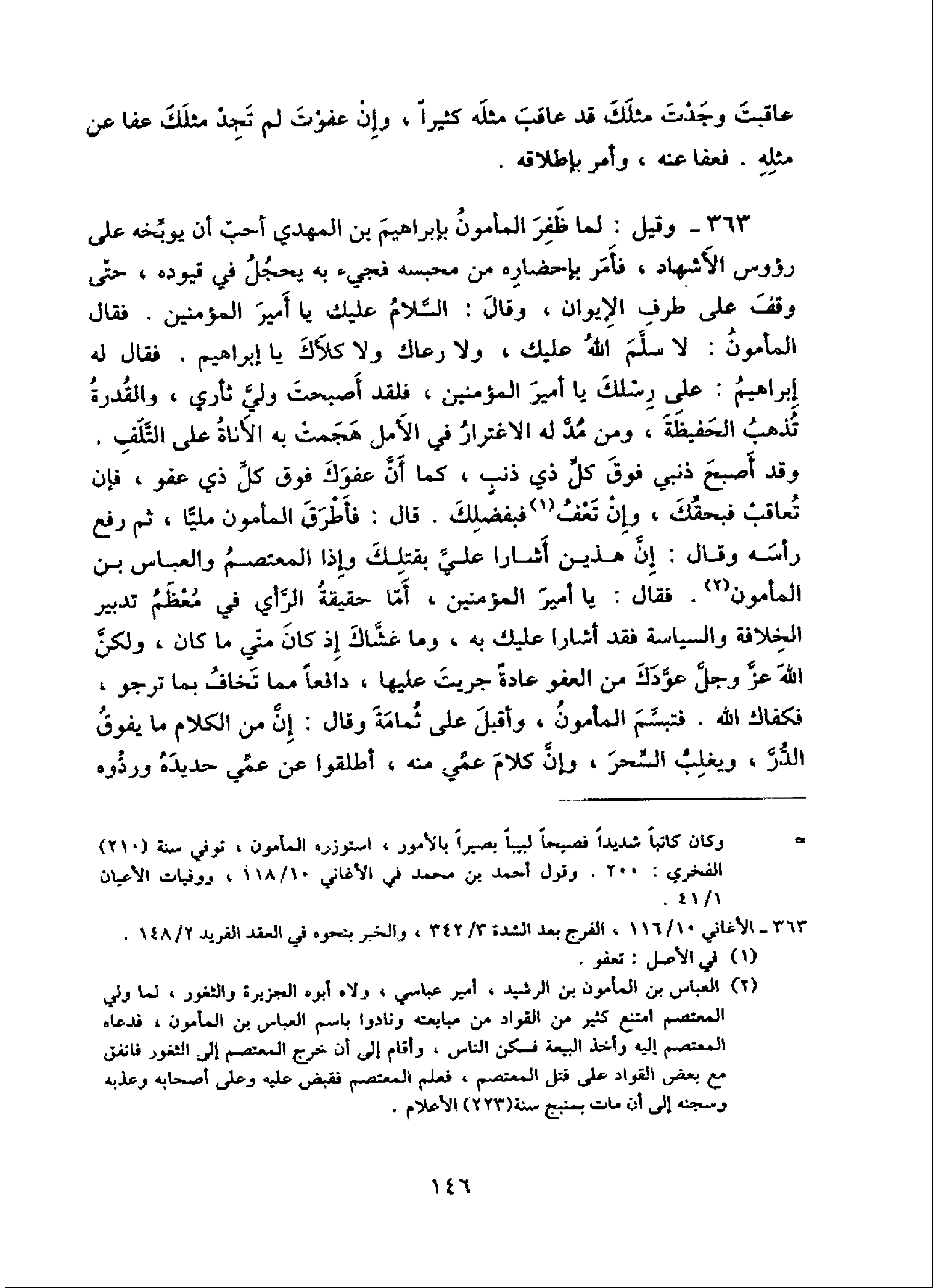 363 - وقيل: لما ظفر المأمون بإبراهيم بن المهدي أحبّ أن يوبّخه على رؤوس الأشهاد، فأمر بإحضاره من محبسه فجيء به يحجل في قيوده، حتّى وقف على طرف الإيوان، وقال: السّلام عليك يا أمير المؤمنين. فقال المأمون: لا سلّم الله عليك، ولا رعاك ولا كلأك يا إبراهيم. فقال له إبراهيم: على رسلك يا أمير المؤمنين، فلقد أصبحت وليّ ثأري، والقدرة تذهب الحفيظة، ومن مدّ له الاغترار في الأمل هجمت به الأناة على التّلف.