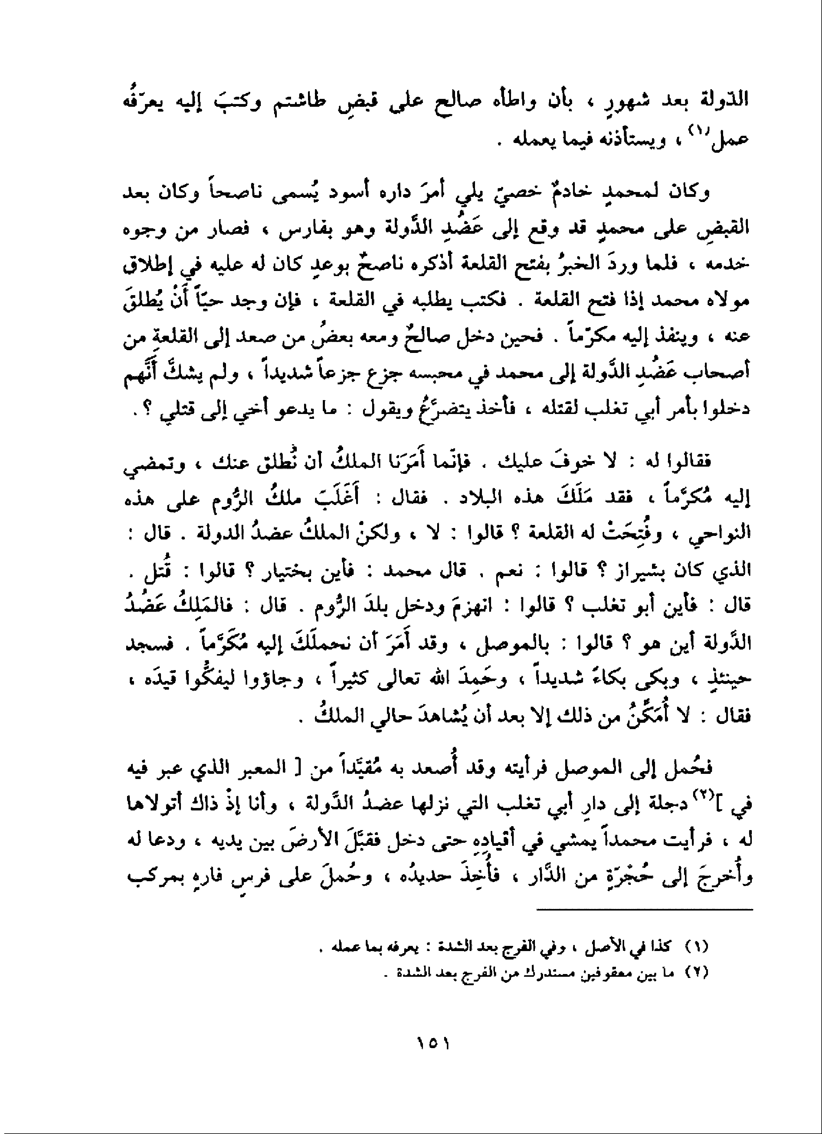 فقالوا له: لا خوف عليك. فإنّما أمرنا الملك أن نطلق عنك، وتمضي إليه مكرّما، فقد ملك هذه البلاد. فقال: أغلب ملك الرّوم على هذه النواحي، وفتحت له القلعة؟ قالوا: لا، ولكن الملك عضد الدولة. قال: