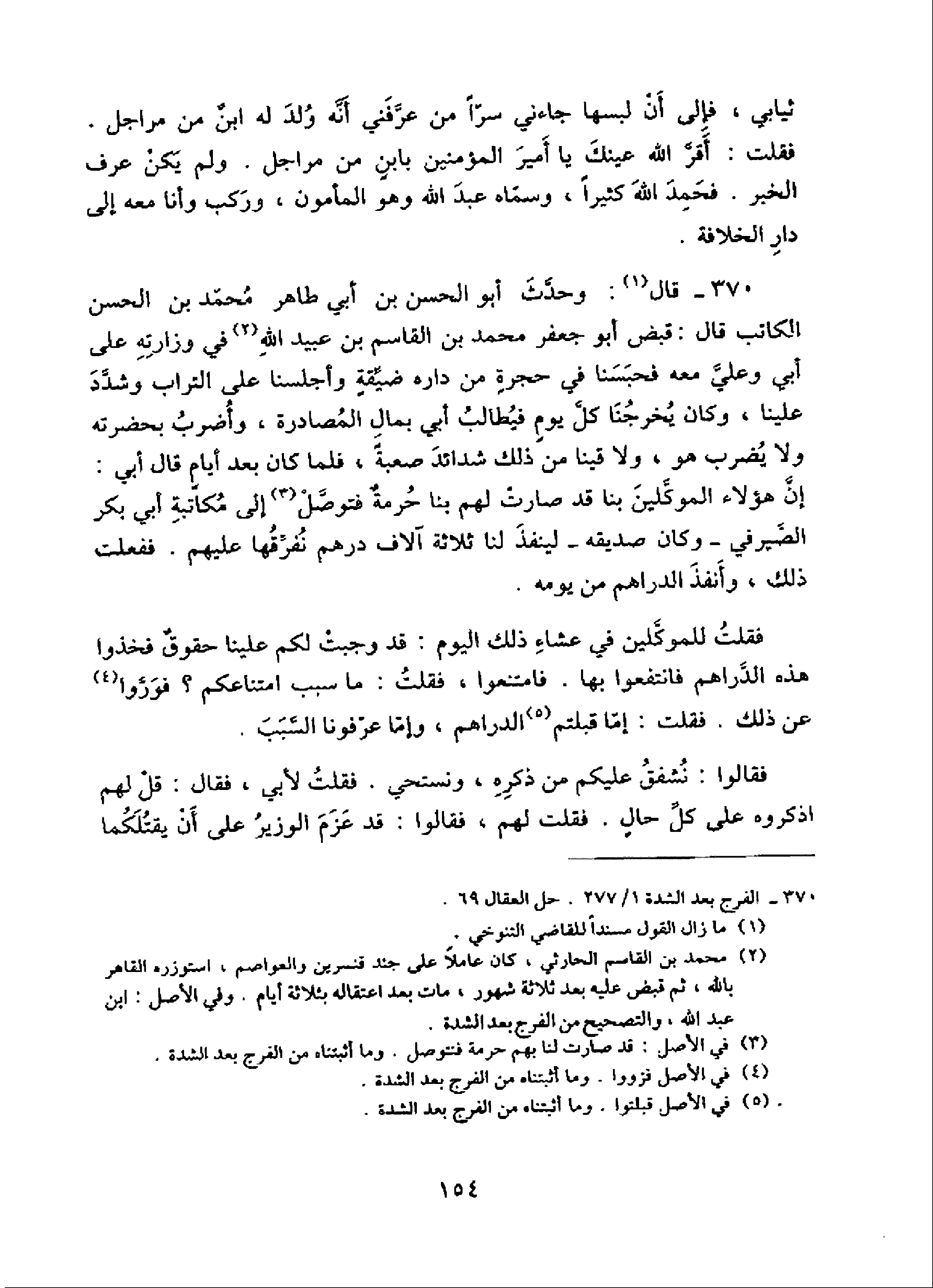370 - قال (¬1): وحدّث أبو الحسن بن أبي طاهر محمّد بن الحسن الكاتب قال: قبض أبو جعفر محمد بن القاسم بن عبيد الله (¬2) في وزارته على أبي وعليّ معه فحبسنا في حجرة من داره ضيّقة وأجلسنا على التراب وشدّد علينا، وكان يخرجنا كلّ يوم فيطالب أبي بمال المصادرة، وأضرب بحضرته ولا يضرب هو، ولا قينا من ذلك شدائد صعبة، فلما كان بعد أيام قال أبي: