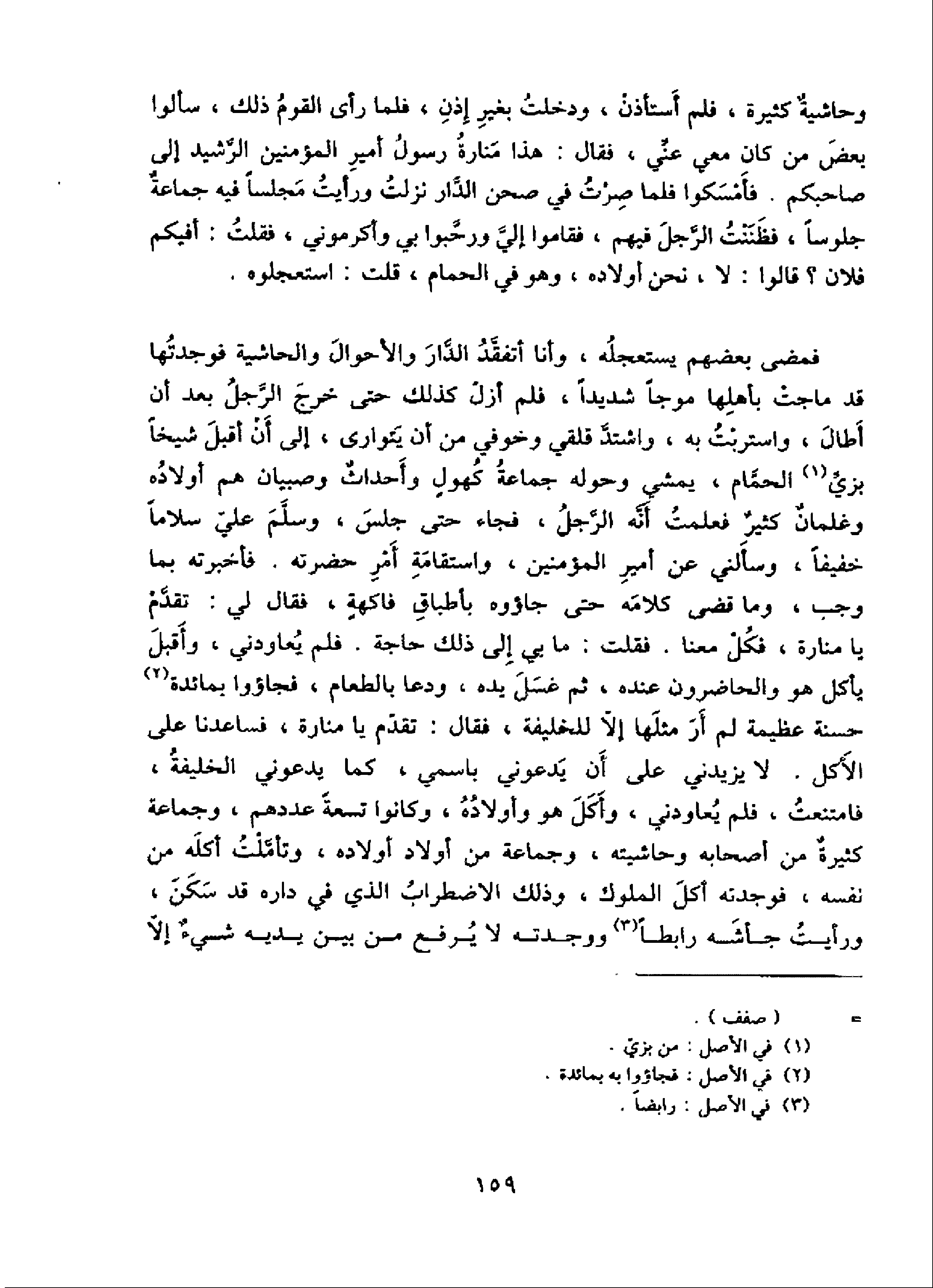 وحاشية كثيرة، فلم أستأذن، ودخلت بغير إذن، فلما رأى القوم ذلك، سألوا بعض من كان معي عنّي، فقال: هذا منارة رسول أمير المؤمنين الرّشيد إلى صاحبكم. فأمسكوا فلما صرت في صحن الدّار نزلت ورأيت مجلسا فيه جماعة جلوسا، فظننت الرّجل فيهم، فقاموا إليّ ورحّبوا بي وأكرموني، فقلت: أفيكم فلان؟ قالوا: لا، نحن أولاده، وهو في الحمام، قلت: استعجلوه.