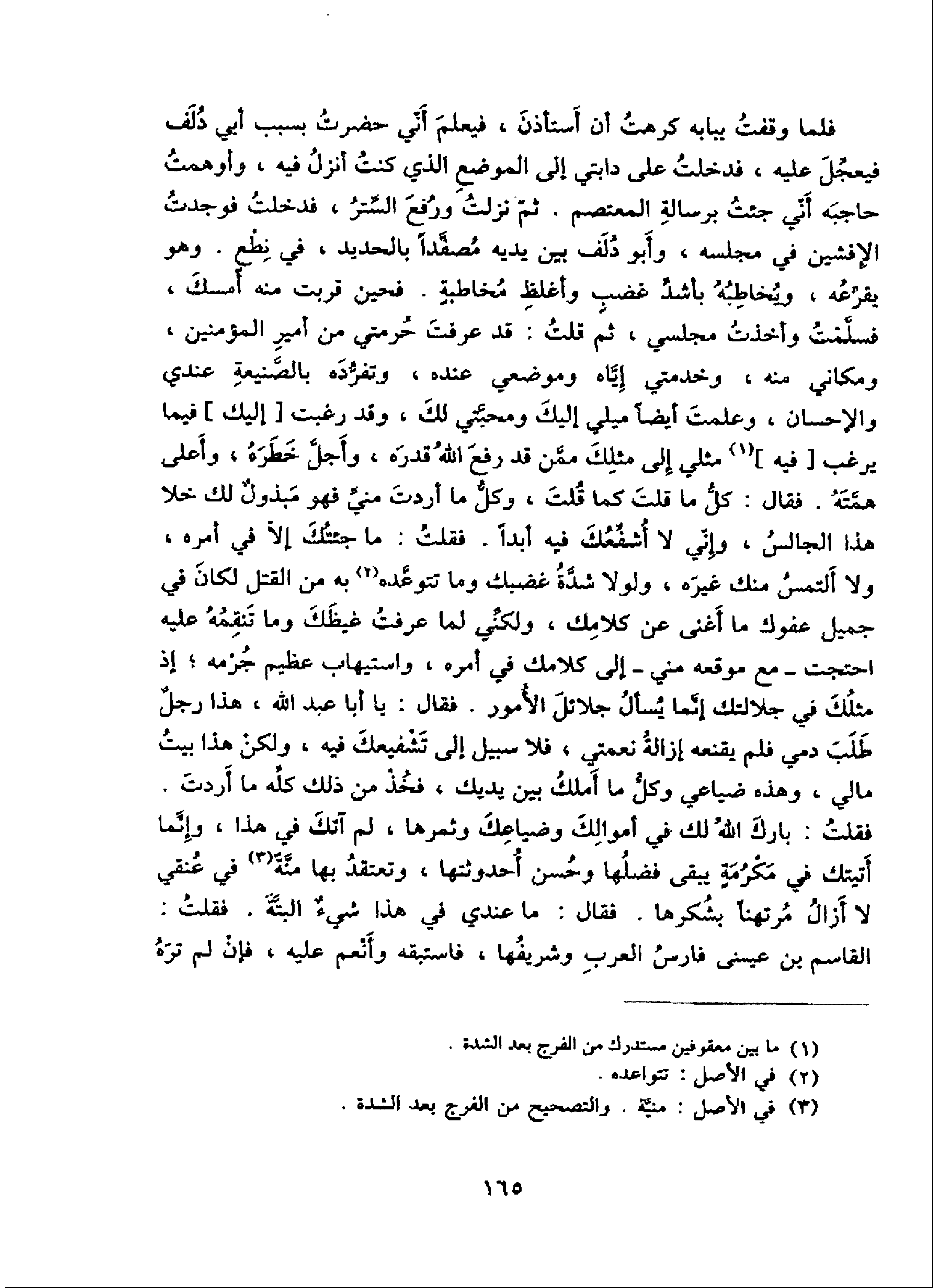 فلما وقفت ببابه كرهت أن أستأذن، فيعلم أنّي حضرت بسبب أبي دلف فيعجّل عليه، فدخلت على دابتي إلى الموضع الذي كنت أنزل فيه، وأوهمت حاجبه أنّي جئت برسالة المعتصم. ثمّ نزلت ورفع السّتر، فدخلت فوجدت الإفشين في مجلسه، وأبو دلف بين يديه مصفّدا بالحديد، في نطع. وهو يقرّعه، ويخاطبه بأشدّ غضب وأغلظ مخاطبة. فحين قربت منه أمسك، فسلّمت وأخذت مجلسي، ثم قلت: قد عرفت حرمتي من أمير المؤمنين، ومكاني منه، وخدمتي إيّاه وموضعي عنده، وتفرّده بالصّنيعة عندي والإحسان، وعلمت أيضا ميلي إليك ومحبّتي لك، وقد رغبت [إليك] فيما يرغب [فيه] (¬1) مثلي إلى مثلك ممّن قد رفع الله قدره، وأجلّ خطره، وأعلى همّته. فقال: كلّ ما قلت كما قلت، وكلّ ما أردت منيّ فهو مبذول لك خلا هذا الجالس، وإنّي لا أشفّعك فيه أبدا. فقلت: ما جئتك إلاّ في أمره، ولا ألتمس منك غيره، ولولا شدّة غضبك وما تتوعّده (¬2) به من القتل لكان في جميل عفوك ما أغنى عن كلامك، ولكنّي لما عرفت غيظك وما تنقمه عليه احتجت-مع موقعه مني-إلى كلامك في أمره، واستيهاب عظيم جرمه؛ إذ مثلك في جلالتك إنّما يسأل جلائل الأمور. فقال: يا أبا عبد الله، هذا رجل طلب دمي فلم يقنعه إزالة نعمتي، فلا سبيل إلى تشفيعك فيه، ولكن هذا بيت مالي، وهذه ضياعي وكلّ ما أملك بين يديك، فخذ من ذلك كلّه ما أردت.