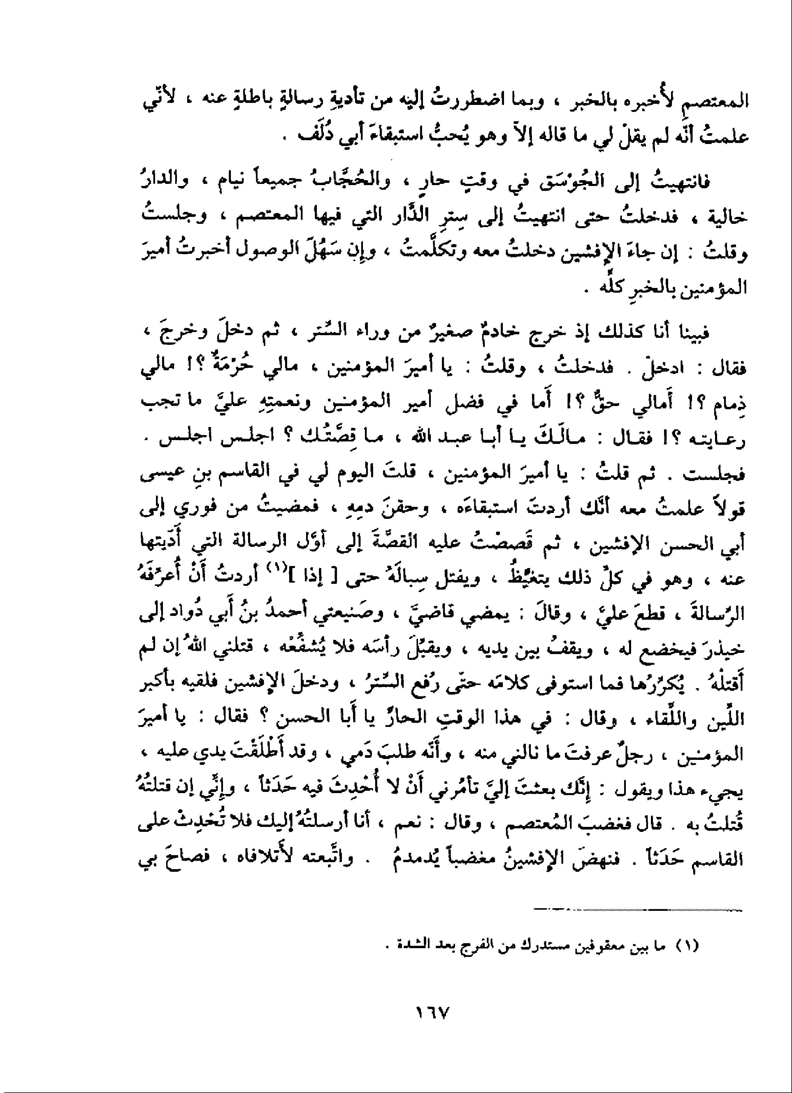 المعتصم لأخبره بالخبر، وبما اضطررت إليه من تأدية رسالة باطلة عنه، لأنّي علمت أنّه لم يقل لي ما قاله إلاّ وهو يحبّ استبقاء أبي دلف.