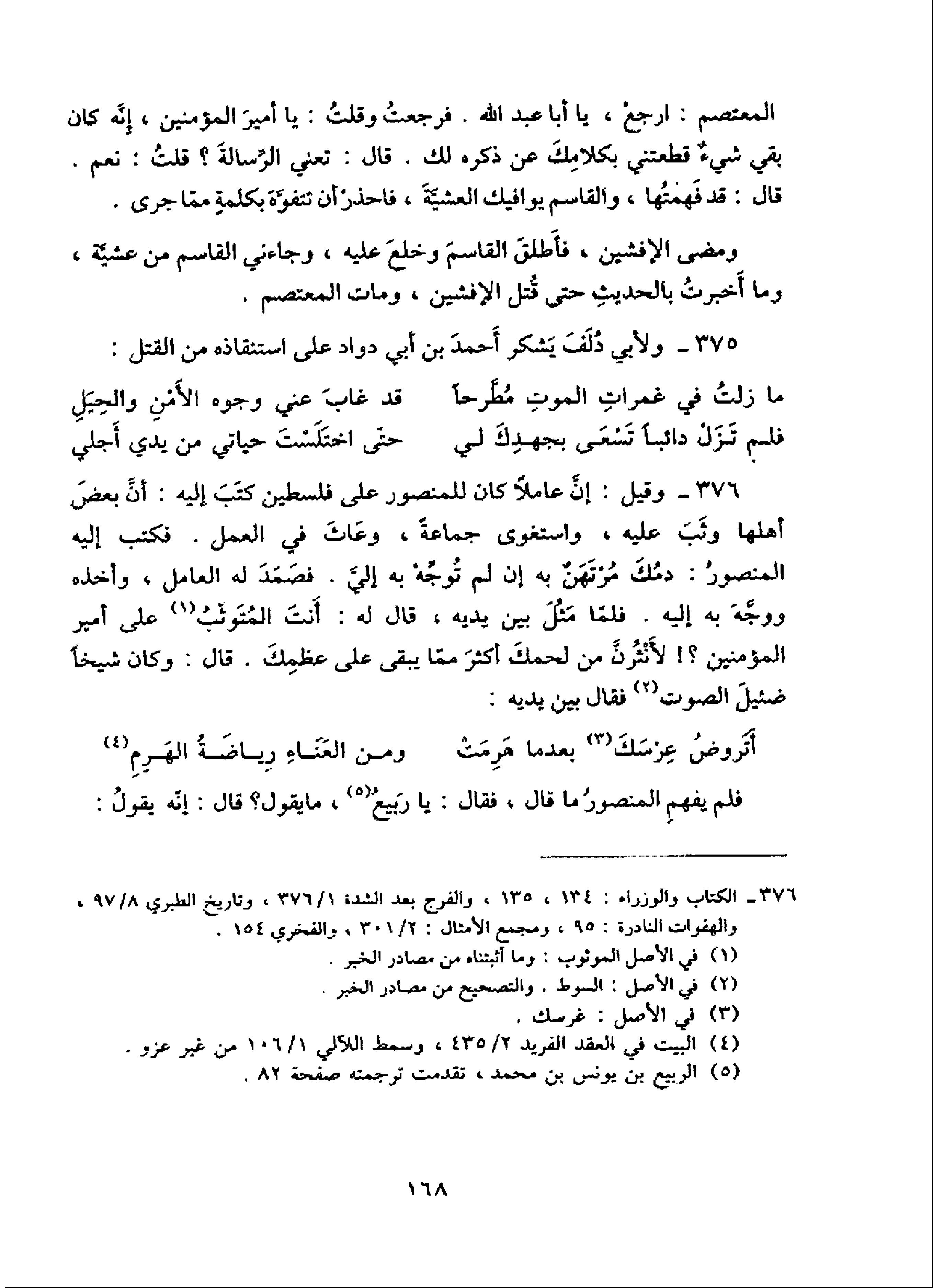 376 - الكتاب والوزراء:134،135، والفرج بعد الشدة 1/ 376، وتاريخ الطبري 8/ 97، والهفوات النادرة:95، ومجمع الأمثال:2/ 301، والفخري 154.