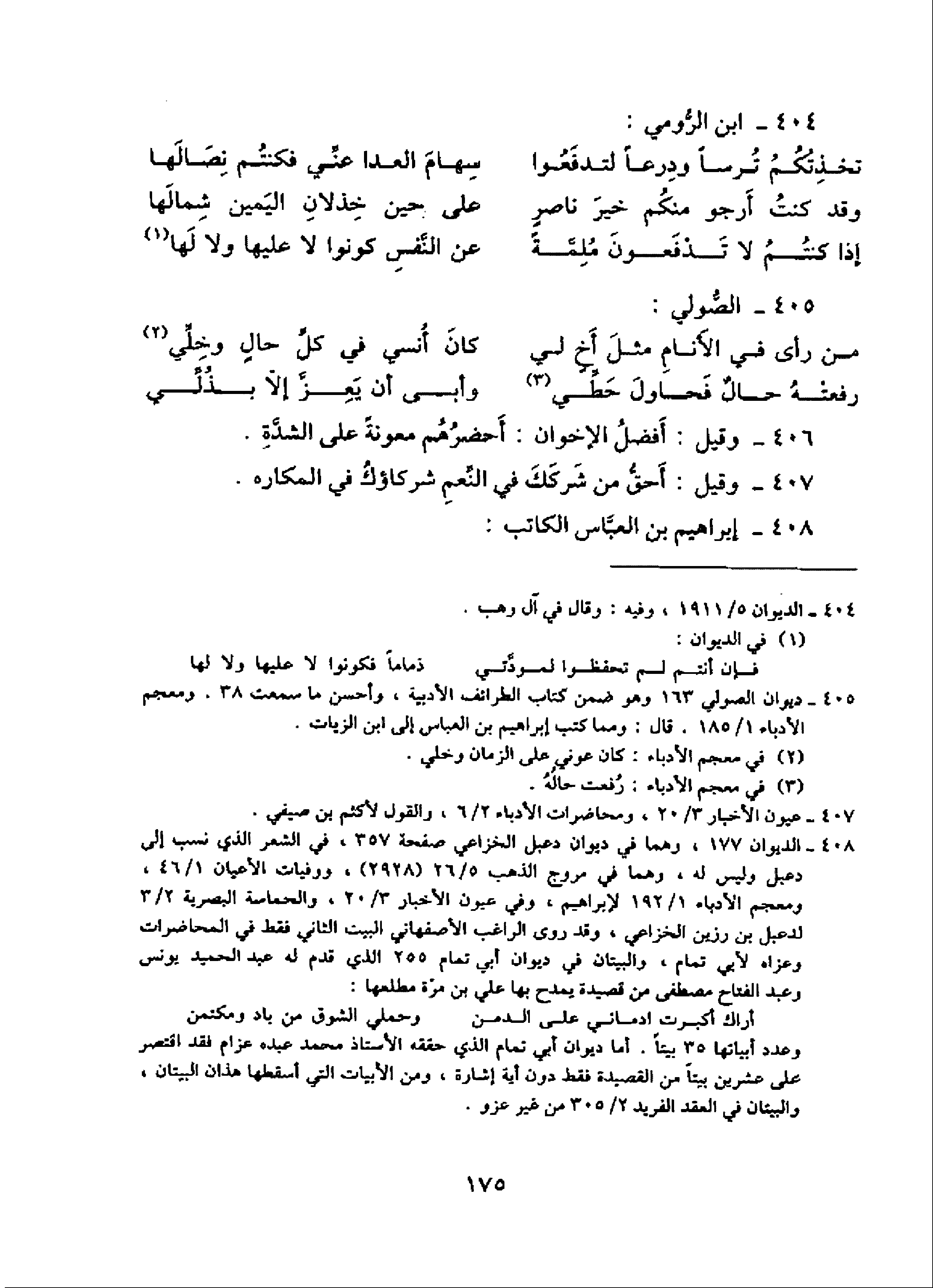 408 - الديوان 177، وهما في ديوان دعبل الخزاعي صفحة 357، في الشعر الذي نسب إلى دعبل وليس له، وهما في مروج الذهب 5/ 26 (2928)، ووفيات الأعيان 1/ 46، ومعجم الأدباء 1/ 192 لإبراهيم، وفي عيون الأخبار 3/ 20، والحماسة البصرية 2/ 3 لدعبل بن رزين الخزاعي، وقد روى الراغب الأصفهاني البيت الثاني فقط في المحاضرات وعزاه لأبي تمام، والبيتان في ديوان أبي تمام 255 الذي قدم له عبد الحميد يونس وعبد الفتاح مصطفى من قصيدة يمدح بها علي بن مرّة مطلعها: