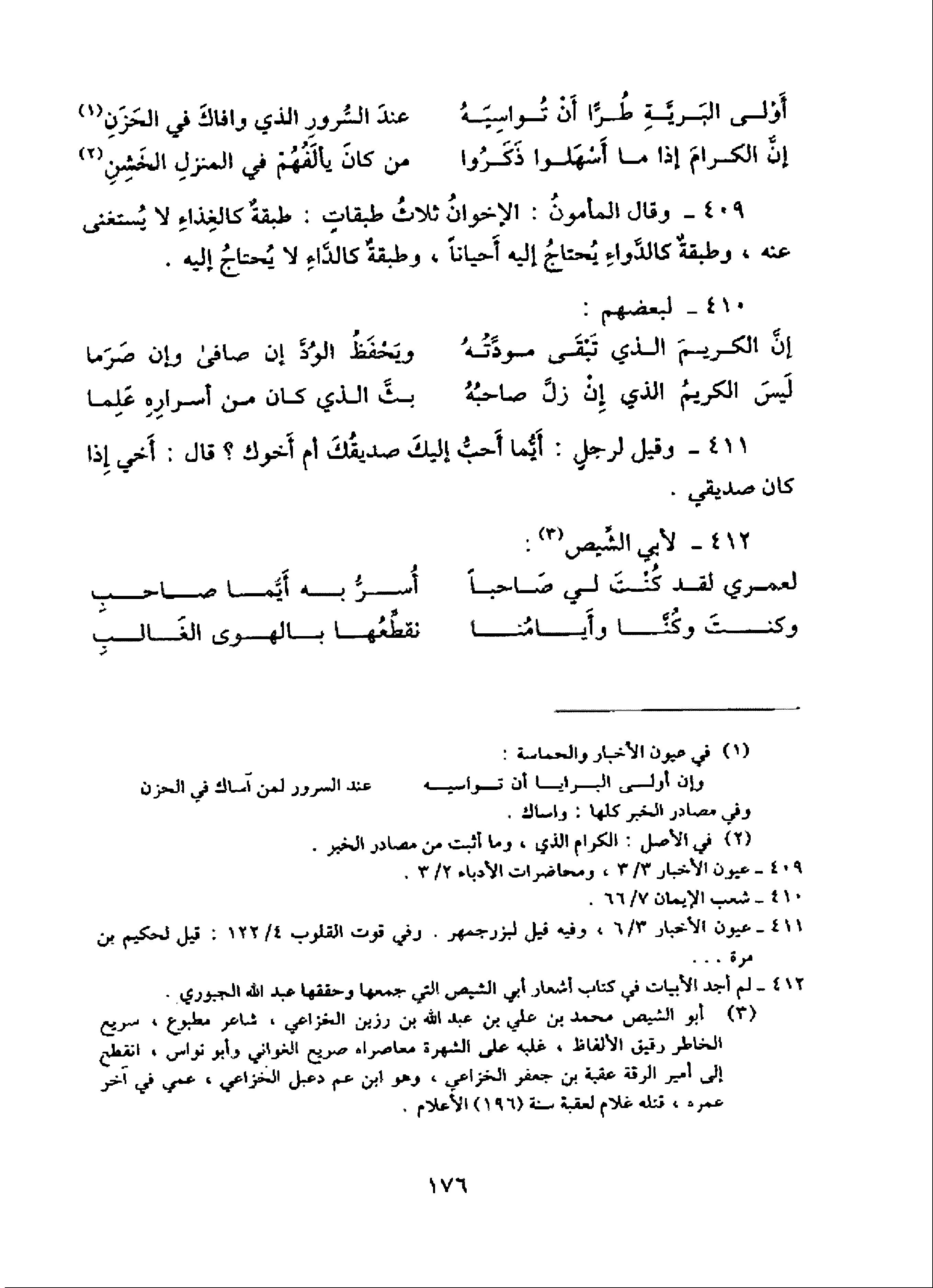 409 - وقال المأمون: الإخوان ثلاث طبقات: طبقة كالغذاء لا يستغنى عنه، وطبقة كالدّواء يحتاج إليه أحيانا، وطبقة كالدّاء لا يحتاج إليه.