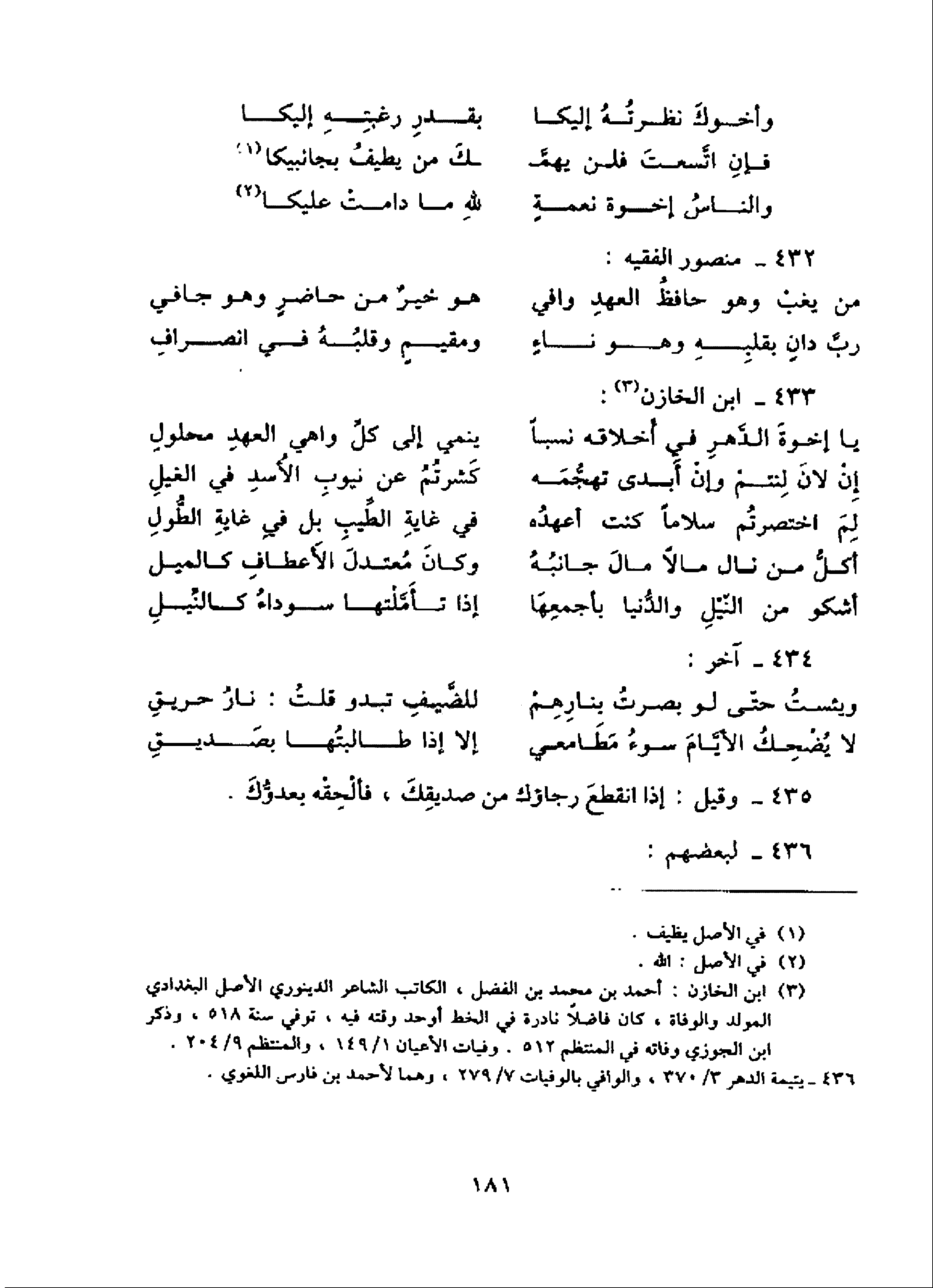 436 - يتيمة الدهر 3/ 370، والوافي بالوفيات 7/ 279، وهما لأحمد بن فارس اللغوي.