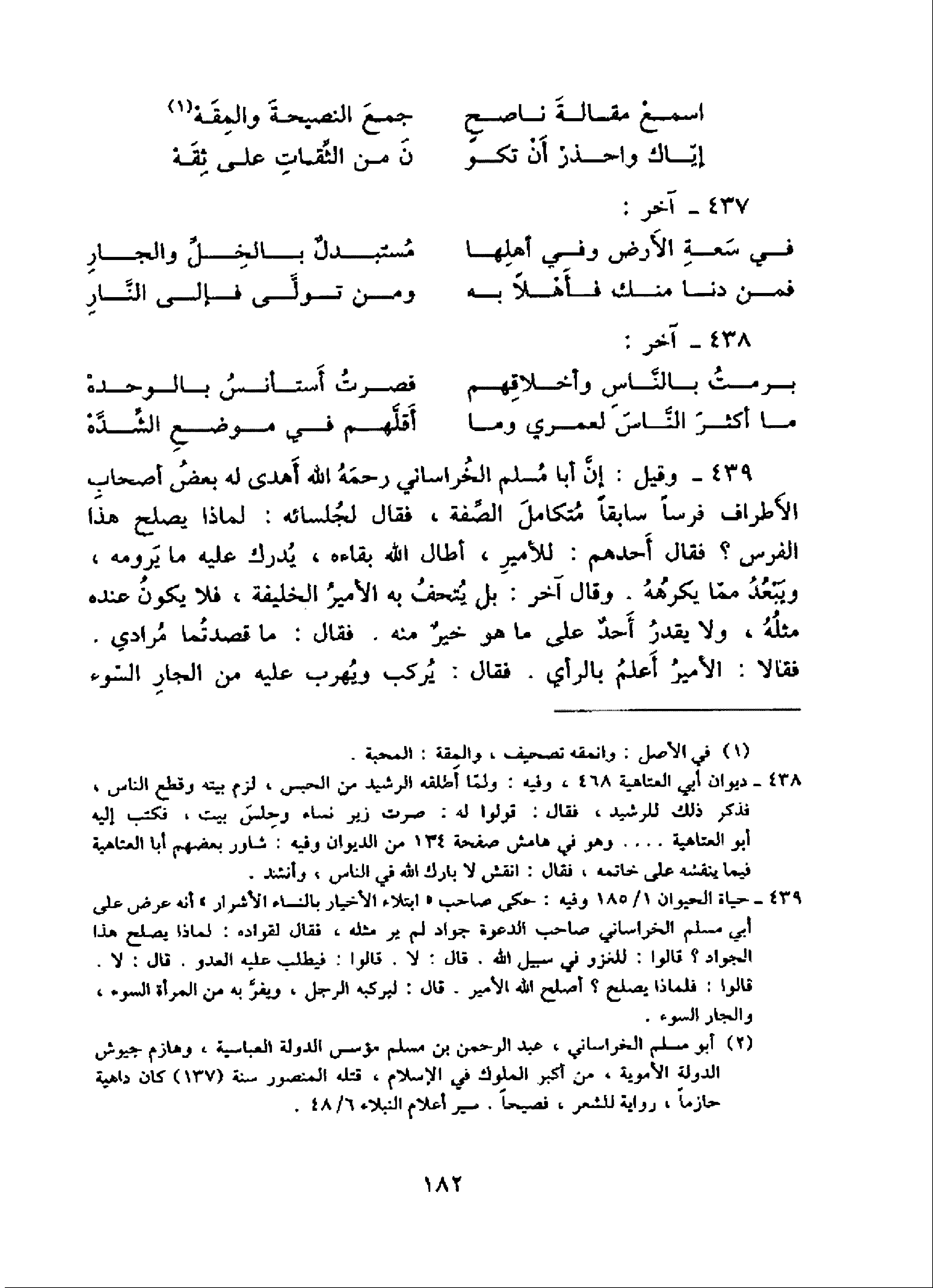 439 - وقيل: إنّ أبا مسلم الخراساني (¬2) رحمه الله أهدى له بعض أصحاب الأطراف فرسا سابقا متكامل الصّفة، فقال لجلسائه: لماذا يصلح هذا الفرس؟ فقال أحدهم: للأمير، أطال الله بقاءه، يدرك عليه ما يرومه، ويبعد ممّا يكرهه. وقال آخر: بل يتحف به الأمير الخليفة، فلا يكون عنده مثله، ولا يقدر أحد على ما هو خير منه. فقال: ما قصدتما مرادي.