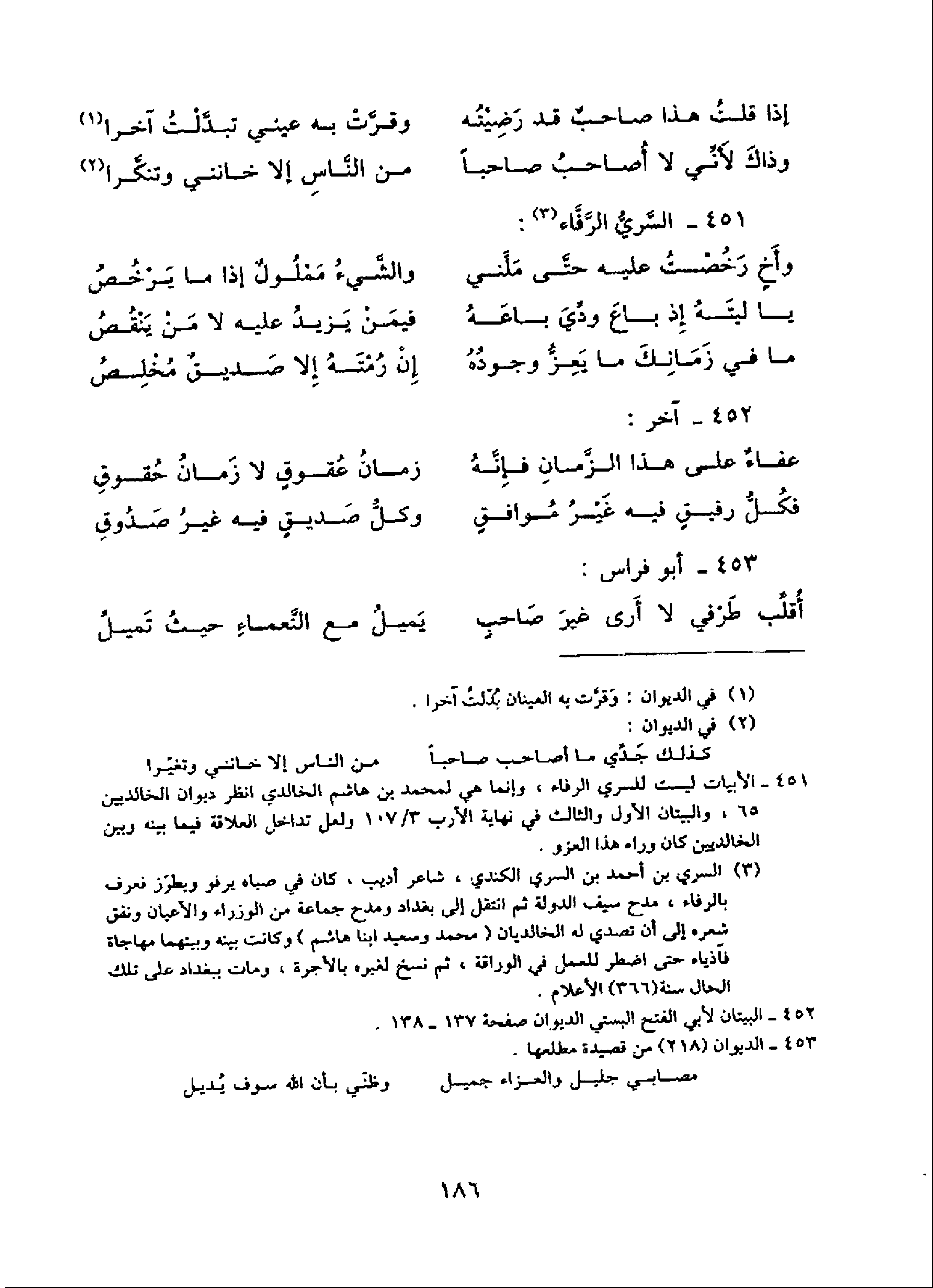 451 - الأبيات ليست للسري الرفاء، وإنما هي لمحمد بن هاشم الخالدي انظر ديوان الخالديين 65، والبيتان الأول والثالث في نهاية الأرب 3/ 107 ولعل تداخل العلاقة فيما بينه وبين الخالديين كان وراء هذا العزو.