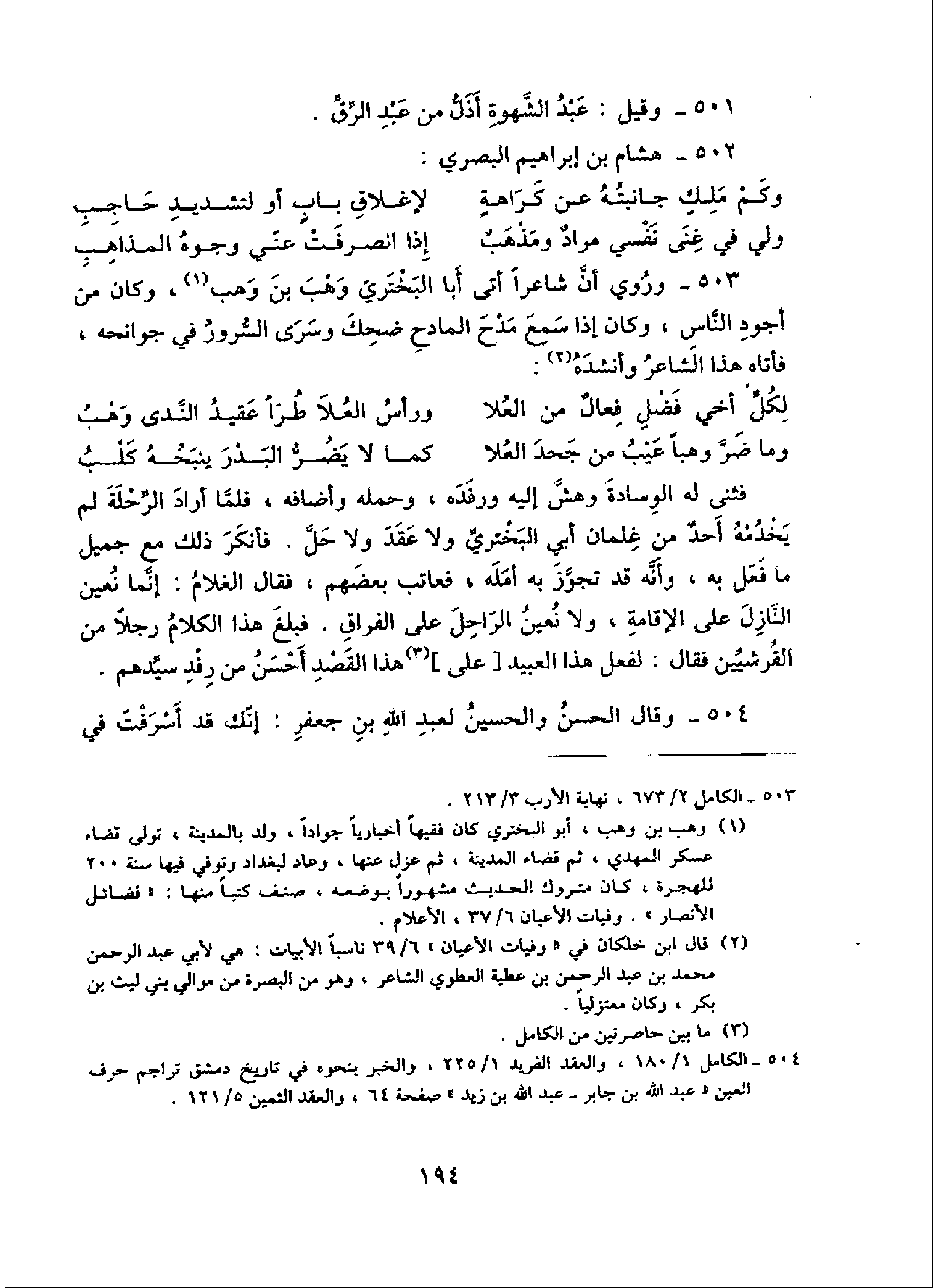 503 - وروي أنّ شاعرا أتى أبا البختريّ وهب بن وهب (¬1)، وكان من أجود النّاس، وكان إذا سمع مدح المادح ضحك وسرى السّرور في جوانحه، فأتاه هذا الشاعر وأنشده (¬2):