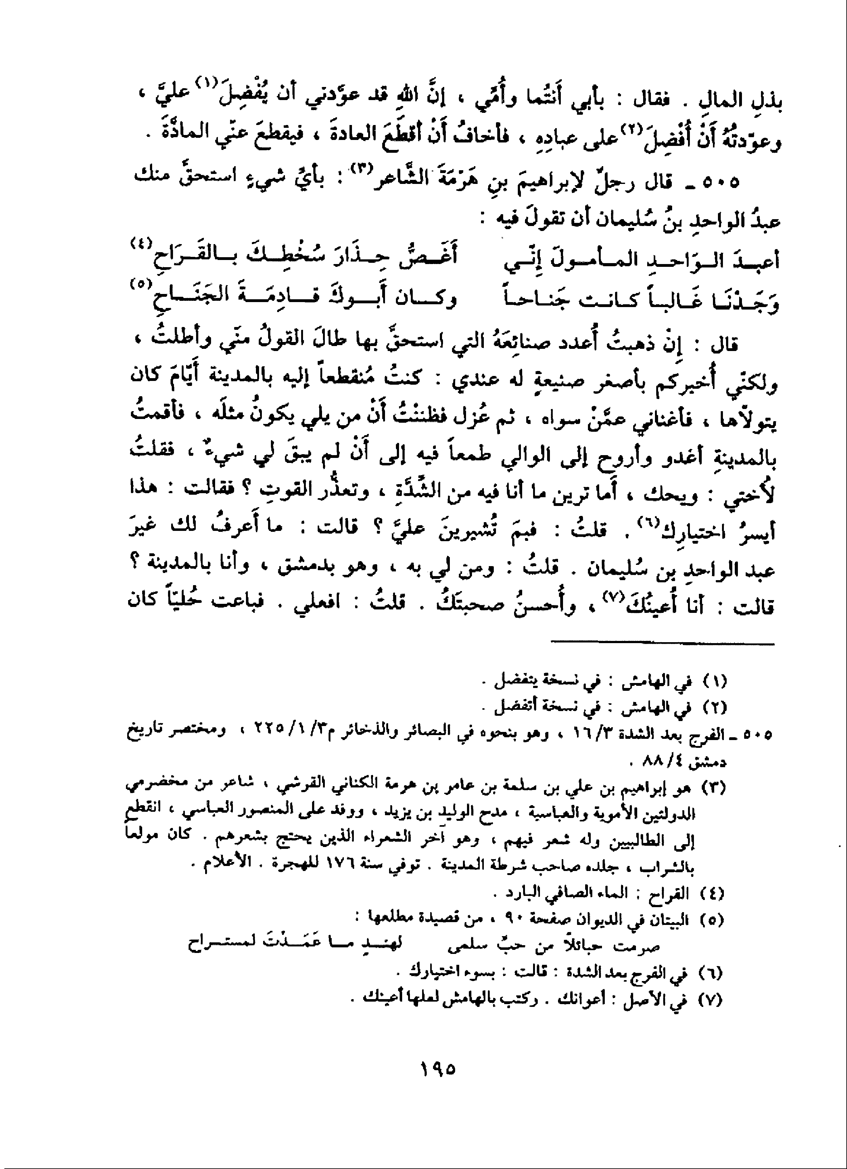 505 - الفرج بعد الشدة 3/ 16، وهو بنحوه في البصائر والذخائر م 3/ 1/225، ومختصر تاريخ دمشق 4/ 88.