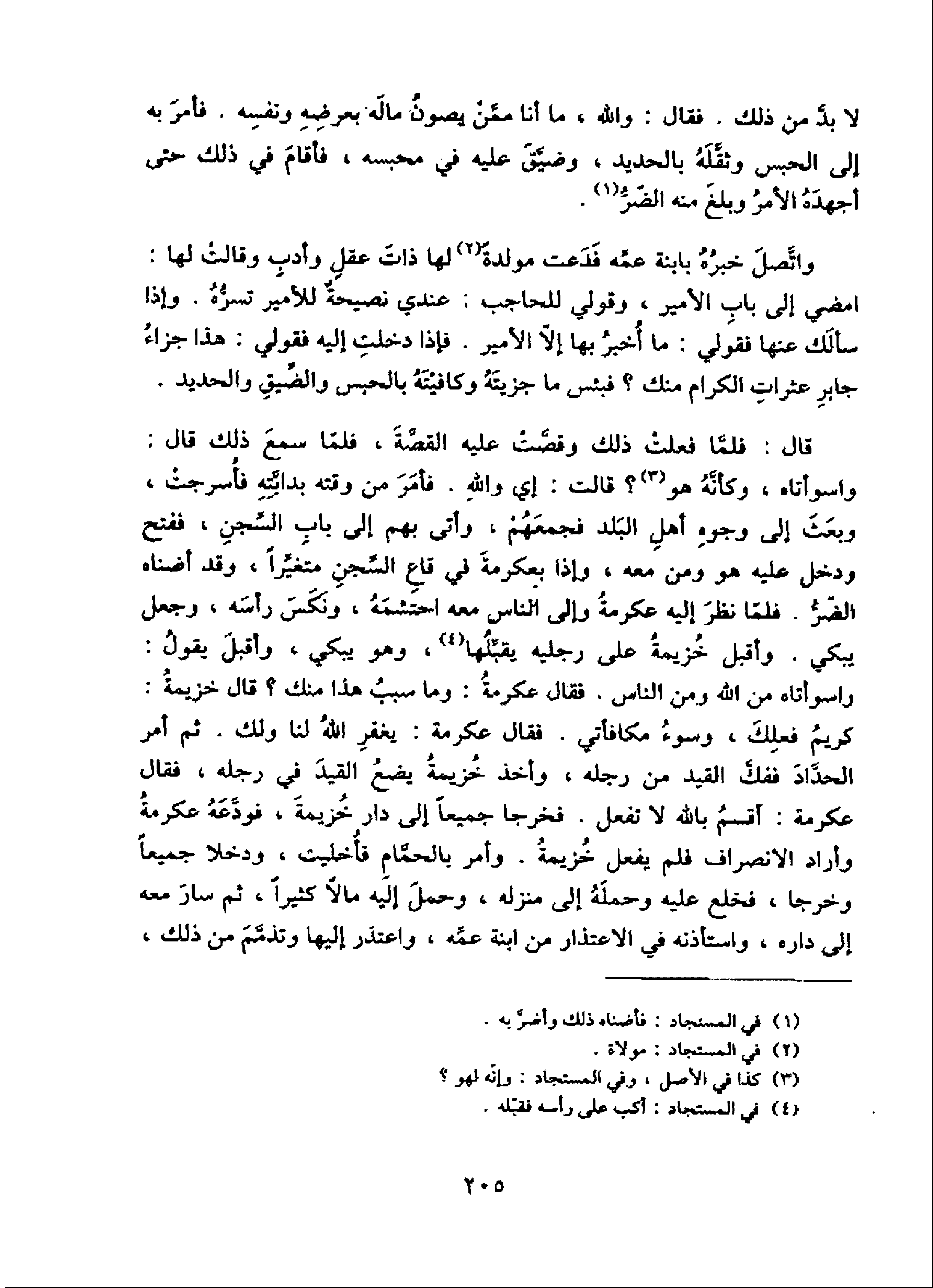 وا سوأتاه، وكأنّه هو (¬3)؟ قالت: إي والله. فأمر من وقته بدابّته فأسرجت، وبعث إلى وجوه أهل البلد فجمعهم، وأتى بهم إلى باب السّجن، ففتح ودخل عليه هو ومن معه، وإذا بعكرمة في قاع السّجن متغيّرا، وقد أضناه الضّرّ. فلمّا نظر إليه عكرمة وإلى الناس معه احتشمه، ونكس رأسه، وجعل يبكي. وأقبل خزيمة على رجليه يقبّلها (¬4)، وهو يبكي، وأقبل يقول: