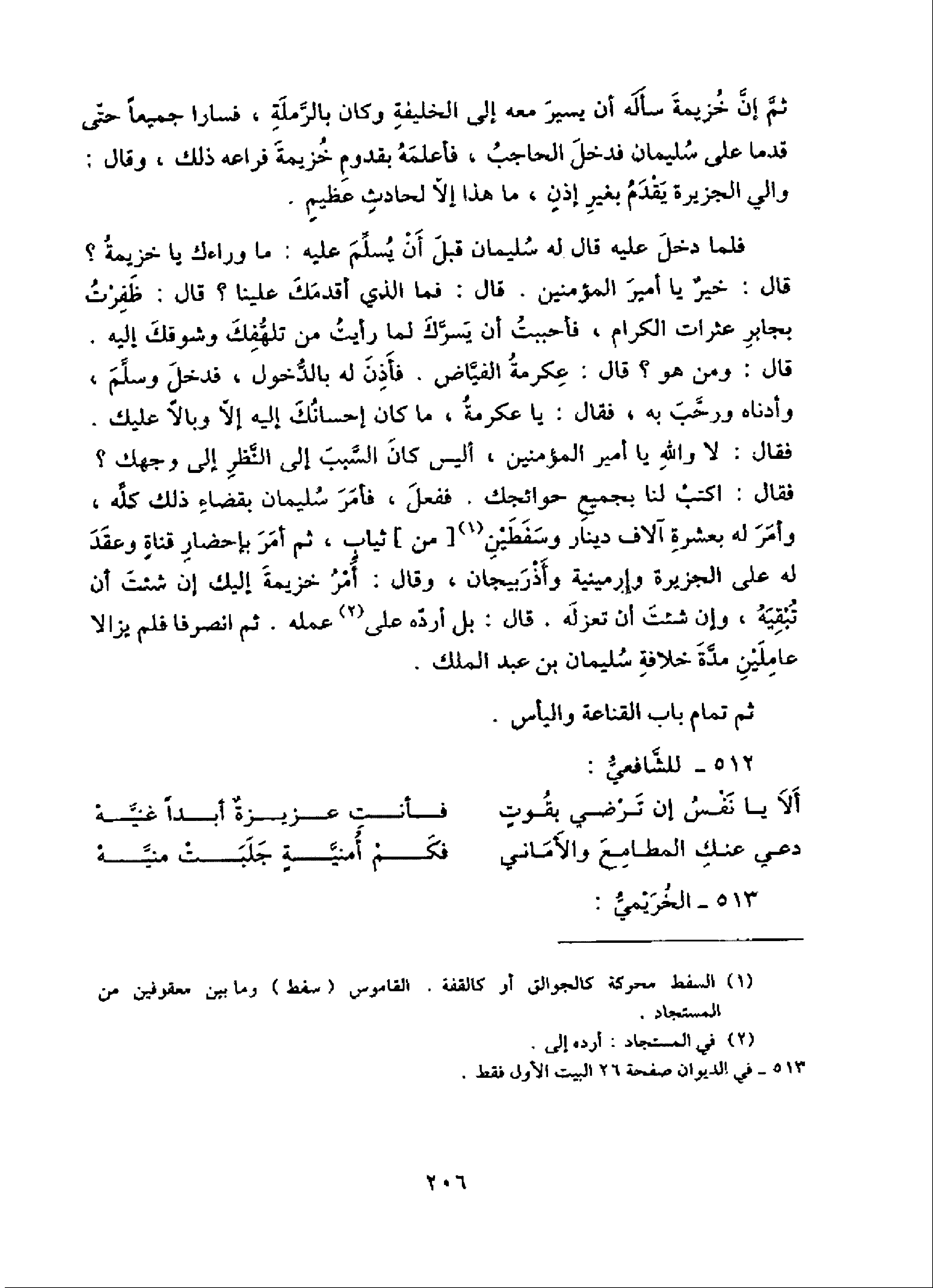 فقال: لا والله يا أمير المؤمنين، أليس كان السّبب إلى النّظر إلى وجهك؟ فقال: اكتب لنا بجميع حوائجك. ففعل، فأمر سليمان بقضاء ذلك كلّه، وأمر له بعشرة آلاف دينار وسفطين (¬1) [من] ثياب، ثم أمر بإحضار قناة وعقد له على الجزيرة وإرمينية وأذربيجان، وقال: أمر خزيمة إليك إن شئت أن تبقيه، وإن شئت أن تعزله. قال: بل أردّه على (¬2) عمله. ثم انصرفا فلم يزالا عاملين مدّة خلافة سليمان بن عبد الملك.