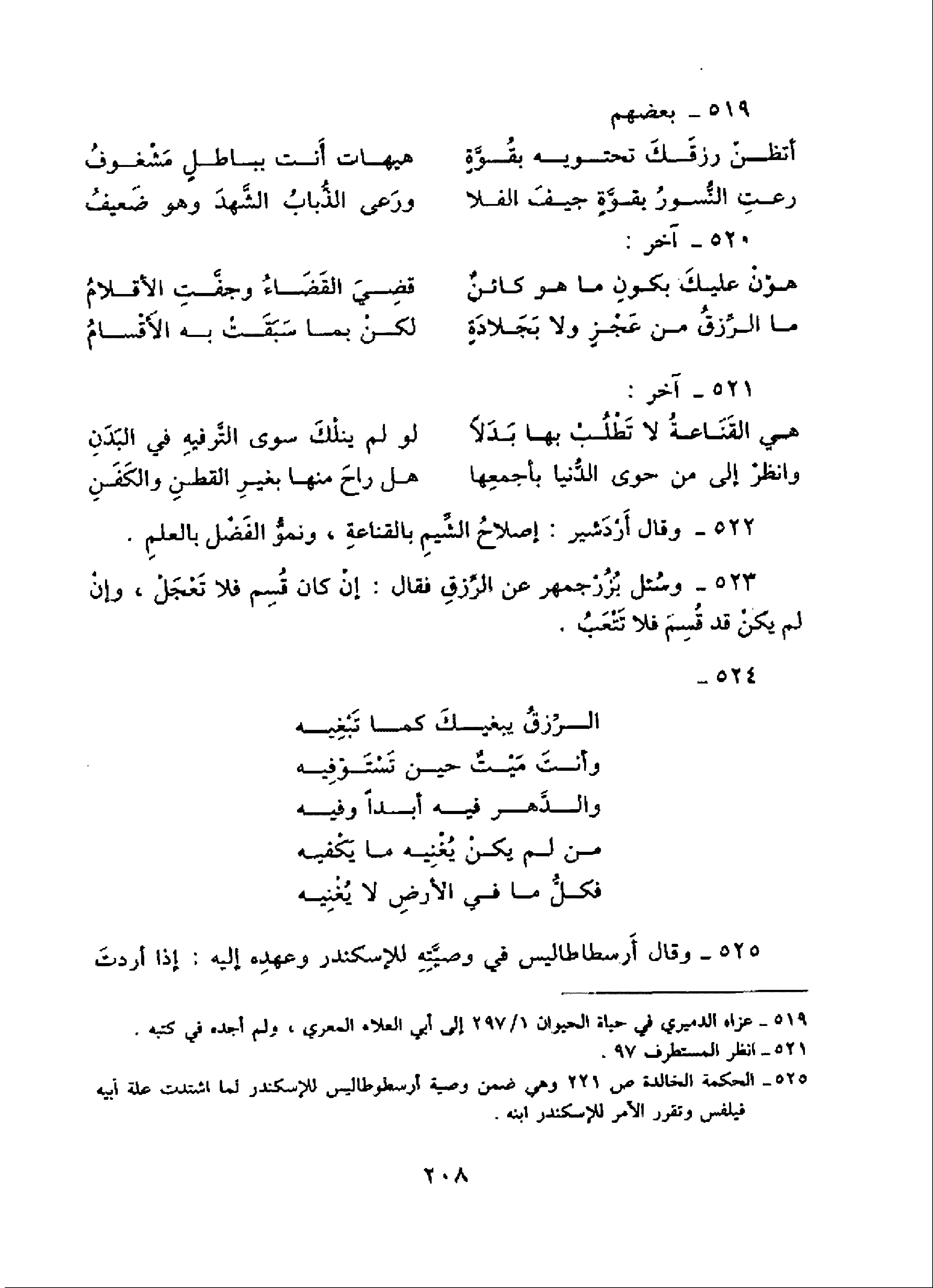 519 - عزاه الدميري في حياة الحيوان 1/ 297 إلى أبي العلاء المعري، ولم أجده في كتبه.