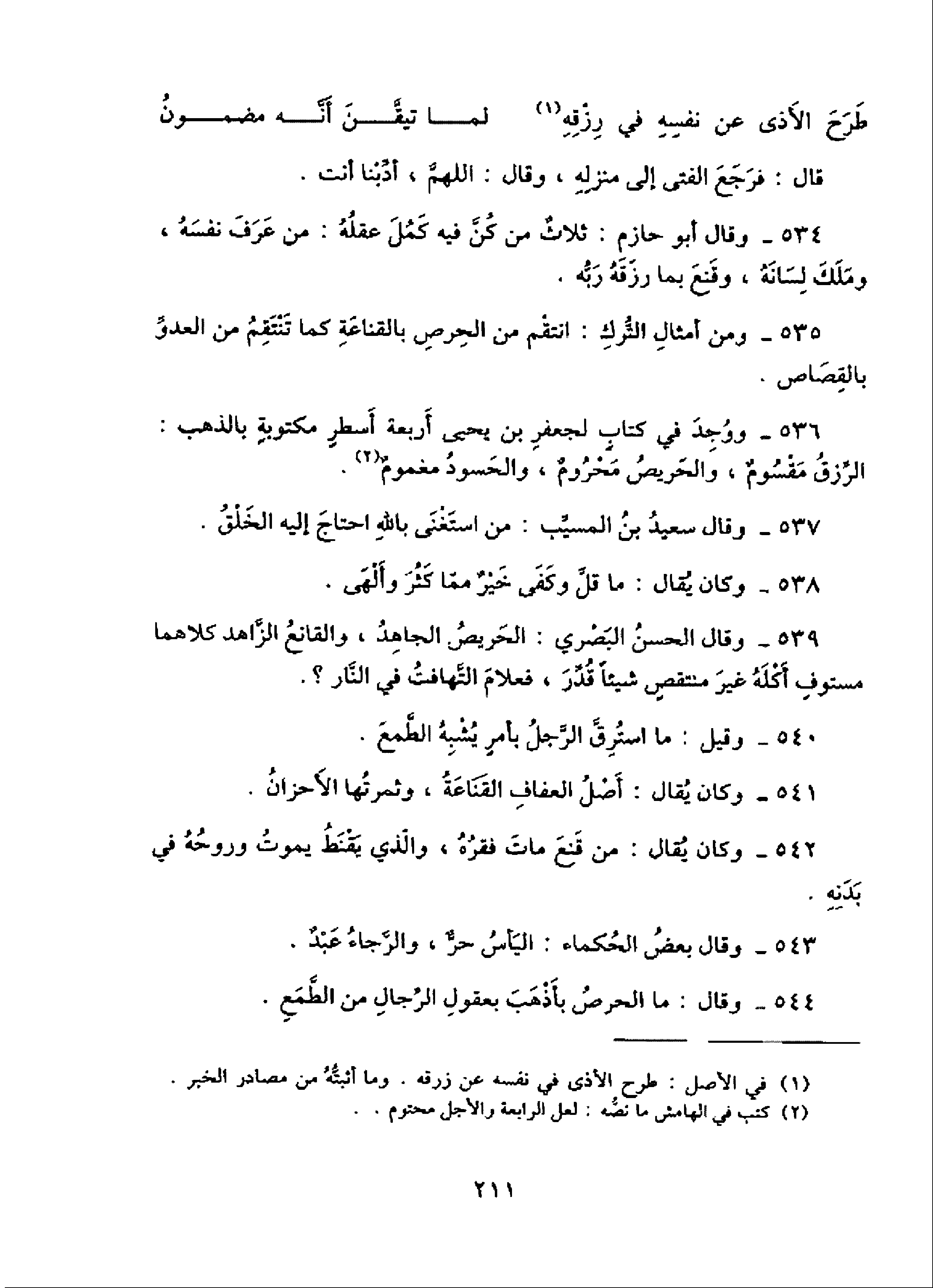 539 - وقال الحسن البصري: الحريص الجاهد، والقانع الزّاهد كلاهما مستوف أكله غير منتقص شيئا قدّر، فعلام التّهافت في النّار؟.