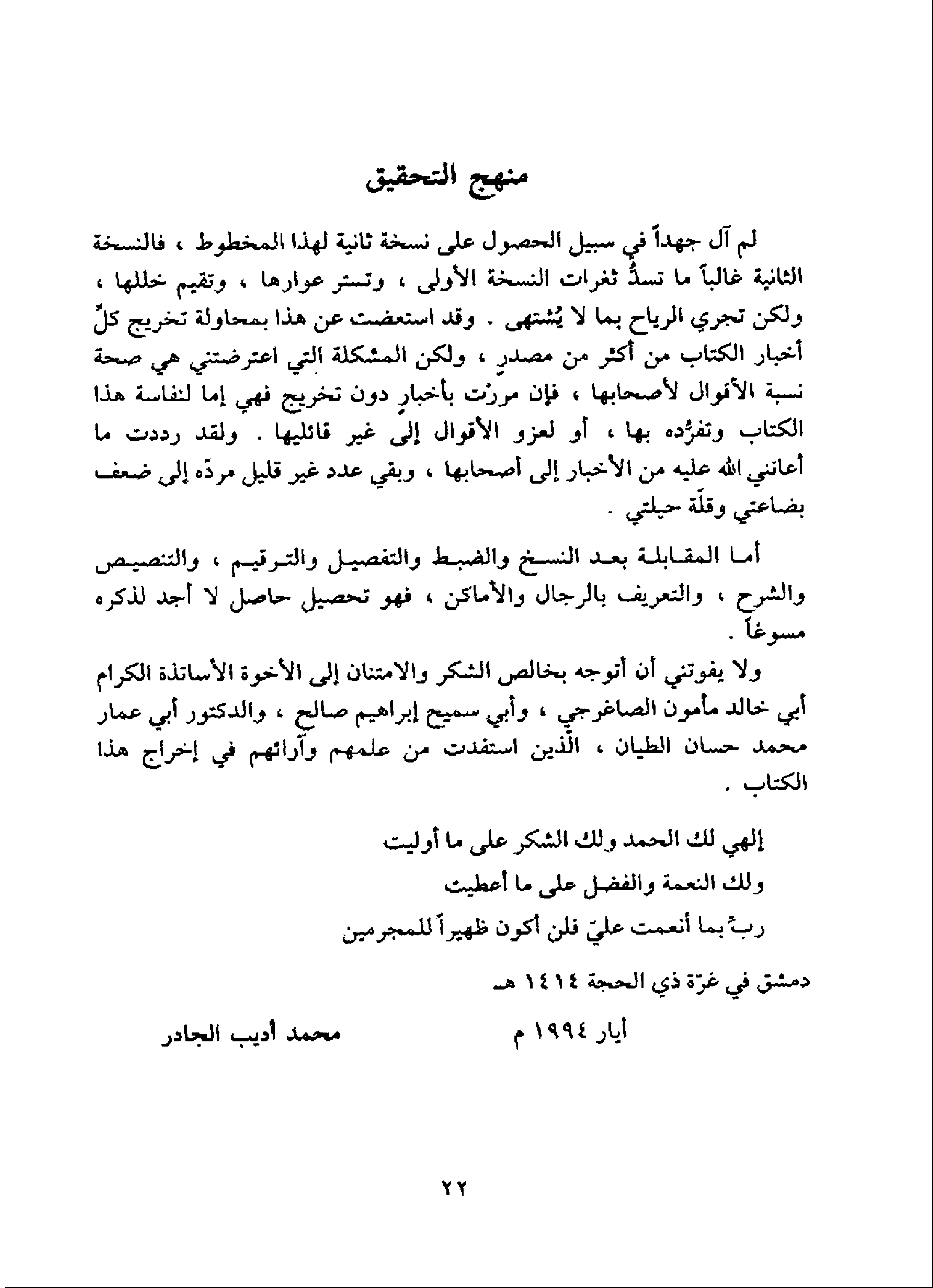 ولا يفوتني أن أتوجه بخالص الشكر والامتنان إلى الأخوة الأساتذة الكرام أبي خالد مأمون الصاغرجي، وأبي سميح إبراهيم صالح، والدكتور أبي عمار محمد حسان الطيان، الّذين استفدت من علمهم وآرائهم في إخراج هذا الكتاب.