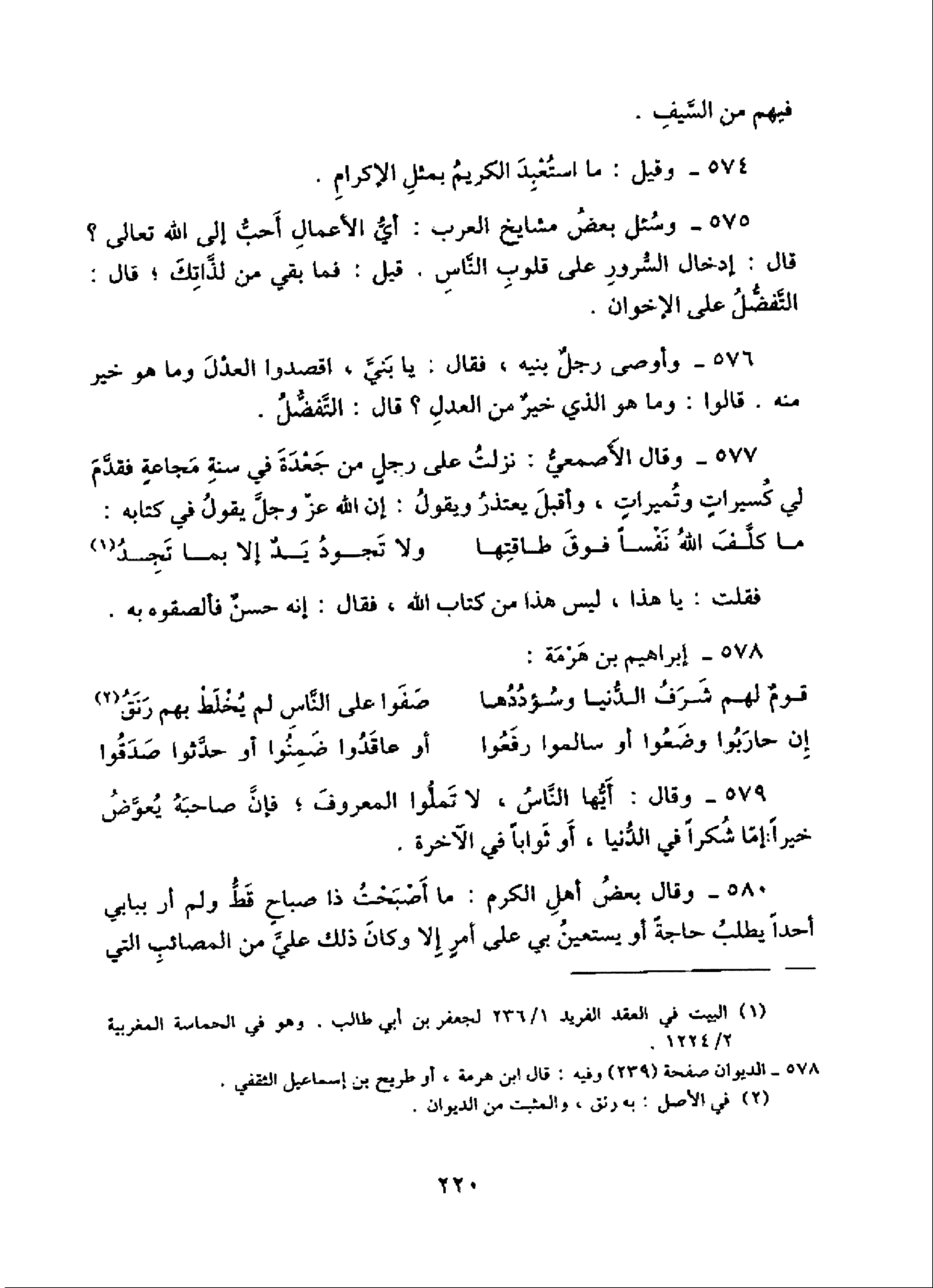 576 - وأوصى رجل بنيه، فقال: يا بنيّ، اقصدوا العدل وما هو خير منه. قالوا: وما هو الذي خير من العدل؟ قال: التّفضّل.