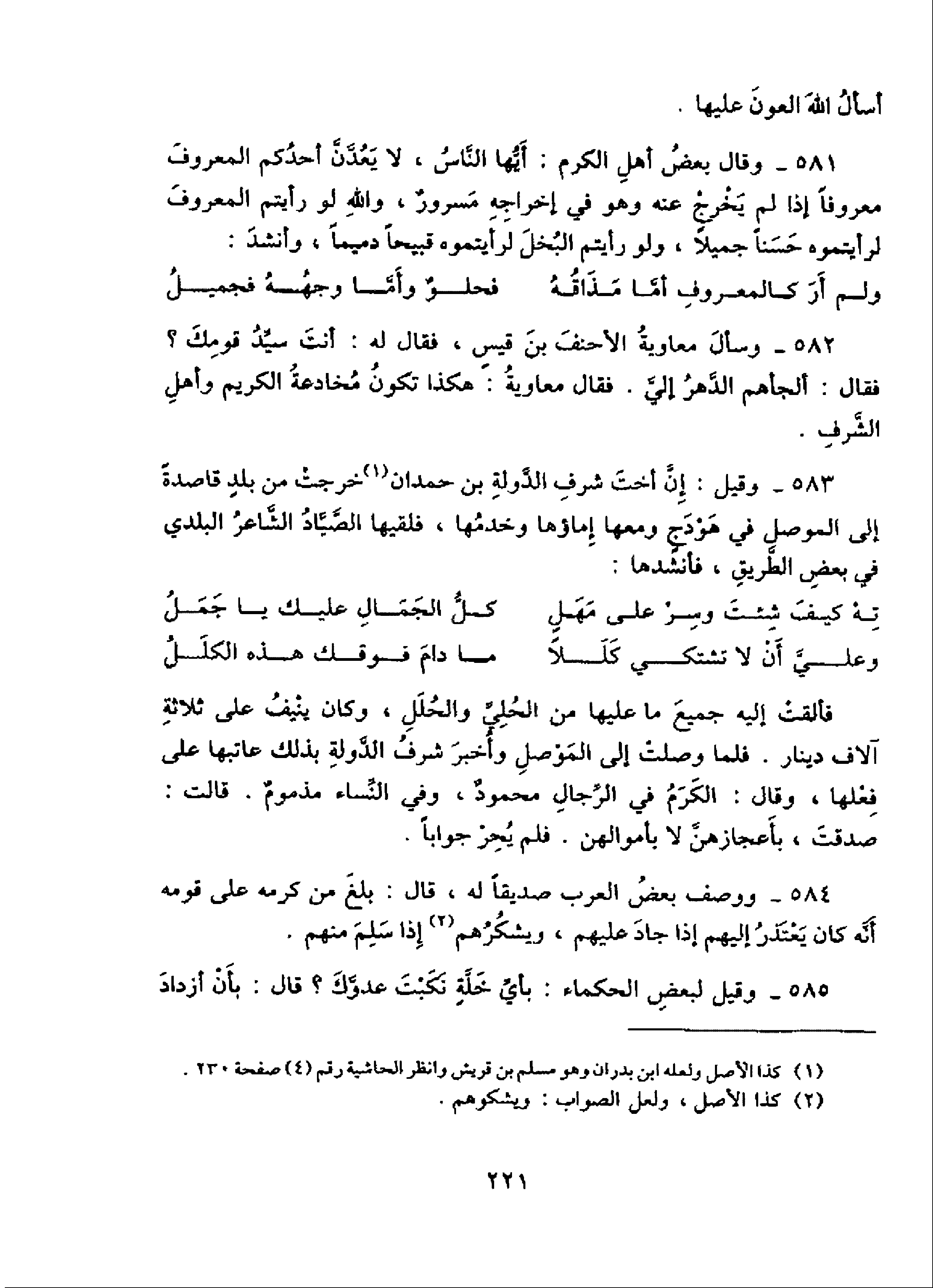 584 - ووصف بعض العرب صديقا له، قال: بلغ من كرمه على قومه أنّه كان يعتذر إليهم إذا جاد عليهم، ويشكرهم (¬2) إذا سلم منهم.