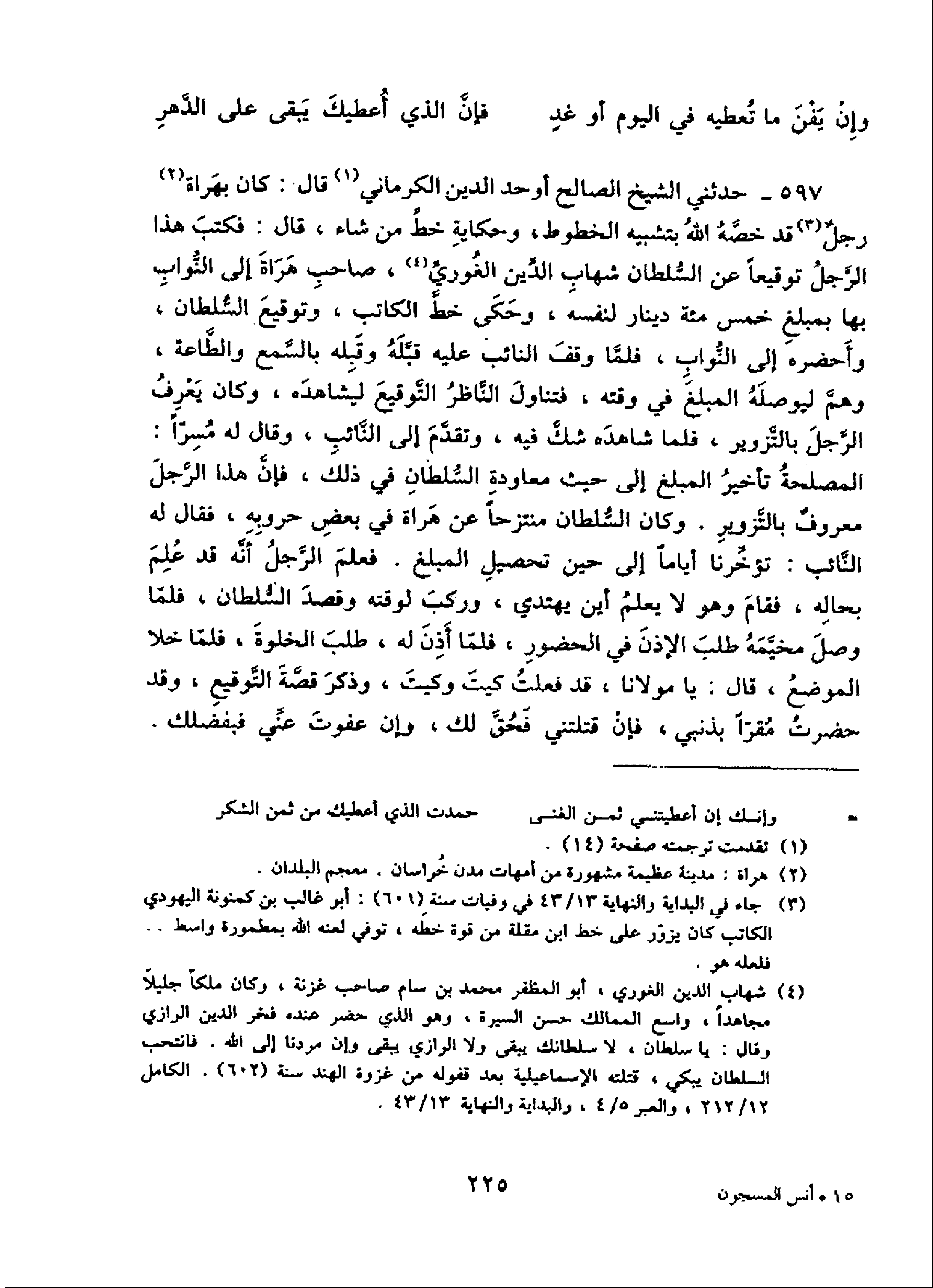 597 - حدثني الشيخ الصالح أوحد الدين الكرماني (¬1) قال: كان بهراة (¬2) رجل (¬3) قد خصّه الله بتشبيه الخطوط، وحكاية خطّ من شاء، قال: فكتب هذا الرّجل توقيعا عن السّلطان شهاب الدّين الغوريّ (¬4)، صاحب هراة إلى النّواب بها بمبلغ خمس مئة دينار لنفسه، وحكى خطّ الكاتب، وتوقيع السّلطان، وأحضره إلى النّواب، فلمّا وقف النائب عليه قبّله وقبله بالسّمع والطّاعة، وهمّ ليوصله المبلغ في وقته، فتناول النّاظر التّوقيع ليشاهده، وكان يعرف الرّجل بالتّزوير، فلما شاهده شكّ فيه، وتقدّم إلى النّائب، وقال له مسرّا: