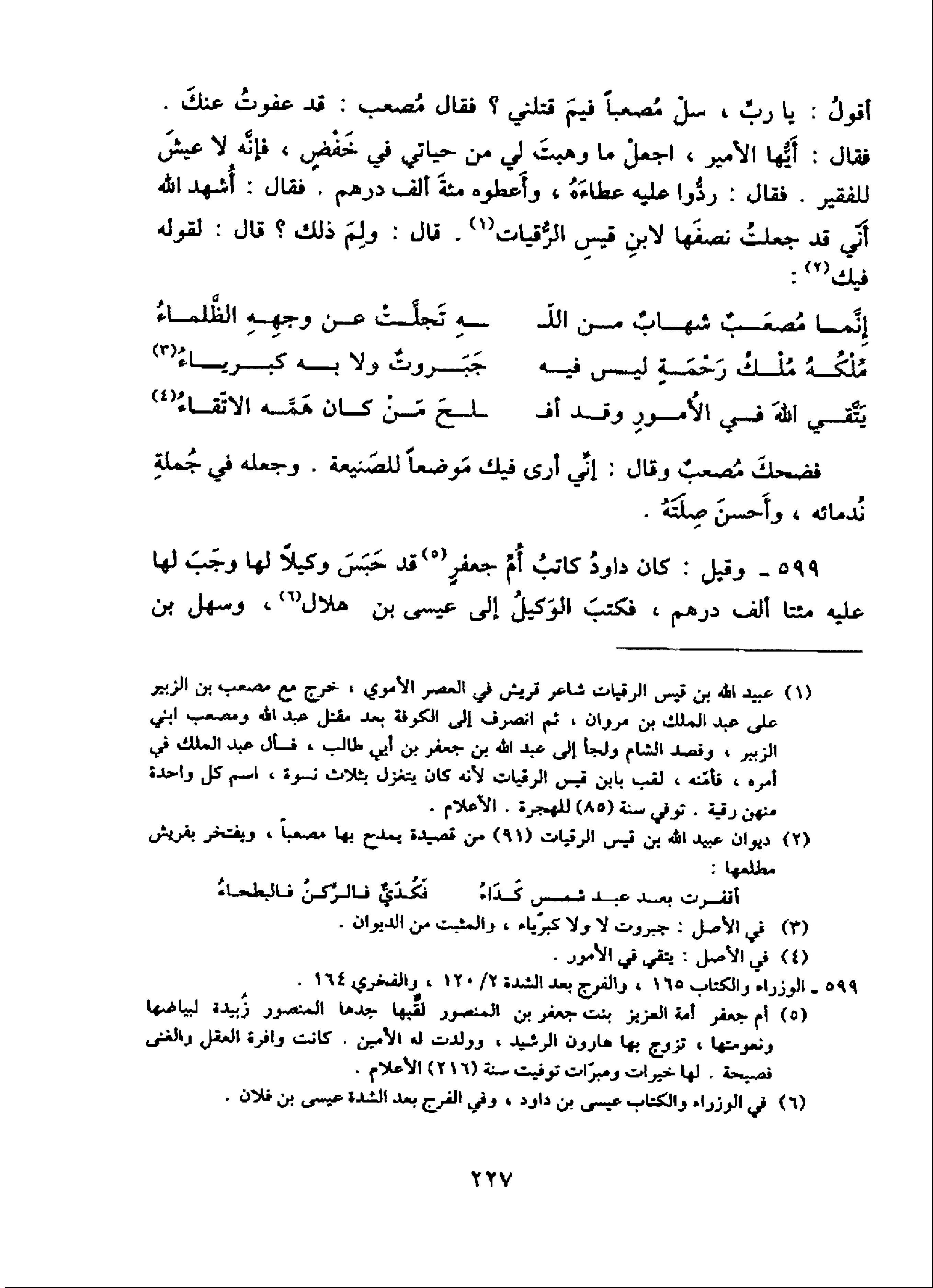 فقال: أيّها الأمير، اجعل ما وهبت لي من حياتي في خفض، فإنّه لا عيش للفقير. فقال: ردّوا عليه عطاءه، وأعطوه مئة ألف درهم. فقال: أشهد الله أنّي قد جعلت نصفها لابن قيس الرّقيات (¬1). قال: ولم ذلك؟ قال: لقوله فيك (¬2):