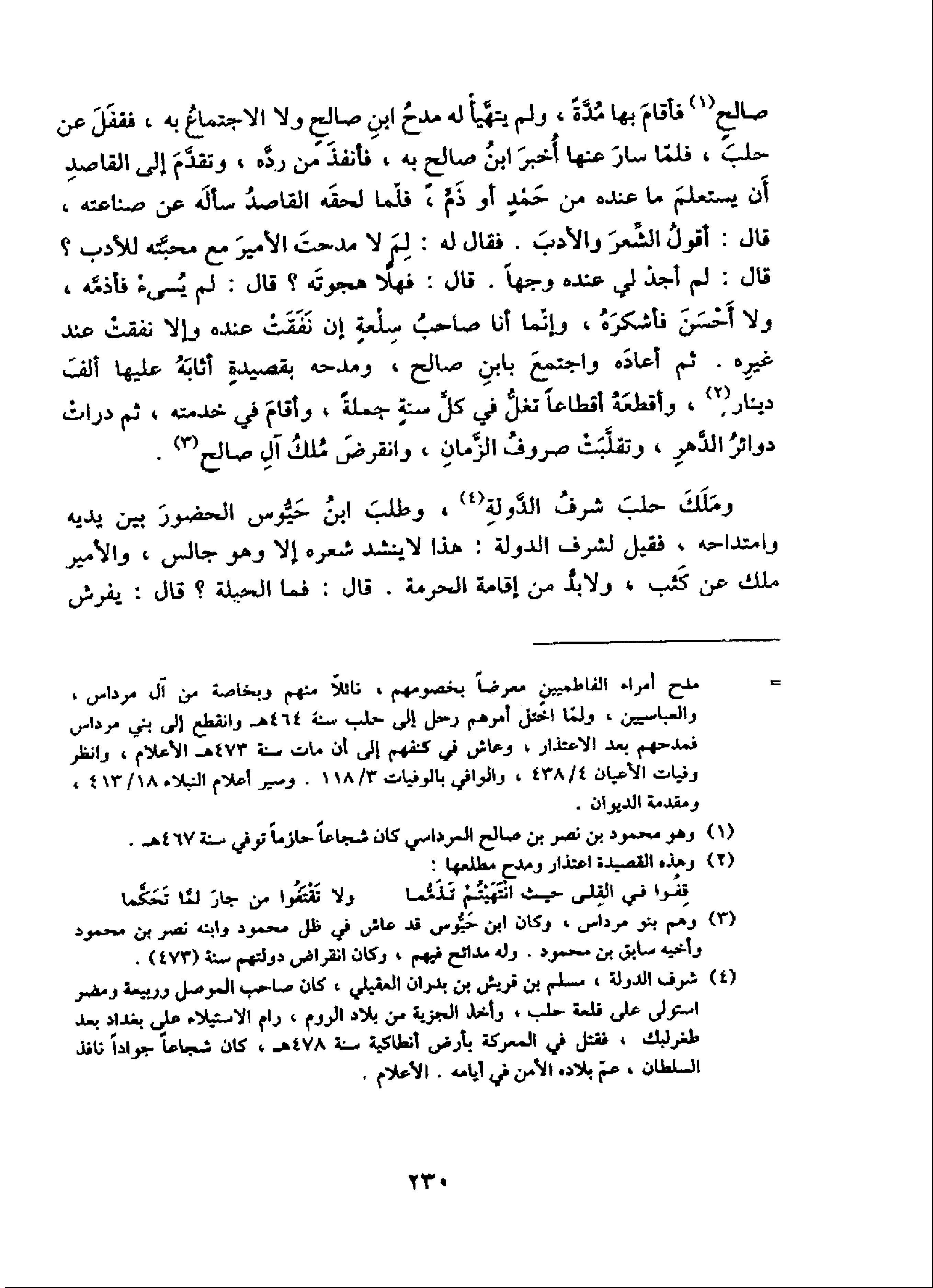 صالح (¬1) فأقام بها مدّة، ولم يتهّيأ له مدح ابن صالح ولا الاجتماع به، فقفل عن حلب، فلمّا سار عنها أخبر ابن صالح به، فأنفذ من ردّه، وتقدّم إلى القاصد أن يستعلم ما عنده من حمد أو ذمّ، فلّما لحقه القاصد سأله عن صناعته، قال: أقول الشّعر والأدب. فقال له: لم لا مدحت الأمير مع محبّته للأدب؟ قال: لم أجد لي عنده وجها. قال: فهلاّ هجوته؟ قال: لم يسىء فأذمّه، ولا أحسن فأشكره، وإنّما أنا صاحب سلعة إن نفقت عنده وإلا نفقت عند غيره. ثم أعاده واجتمع بابن صالح، ومدحه بقصيدة أثابه عليها ألف دينار (¬2)، وأقطعه أقطاعا تغلّ في كلّ سنة جملة، وأقام في خدمته، ثم درات دوائر الدّهر، وتقلّبت صروف الزّمان، وانقرض ملك آل صالح (¬3).