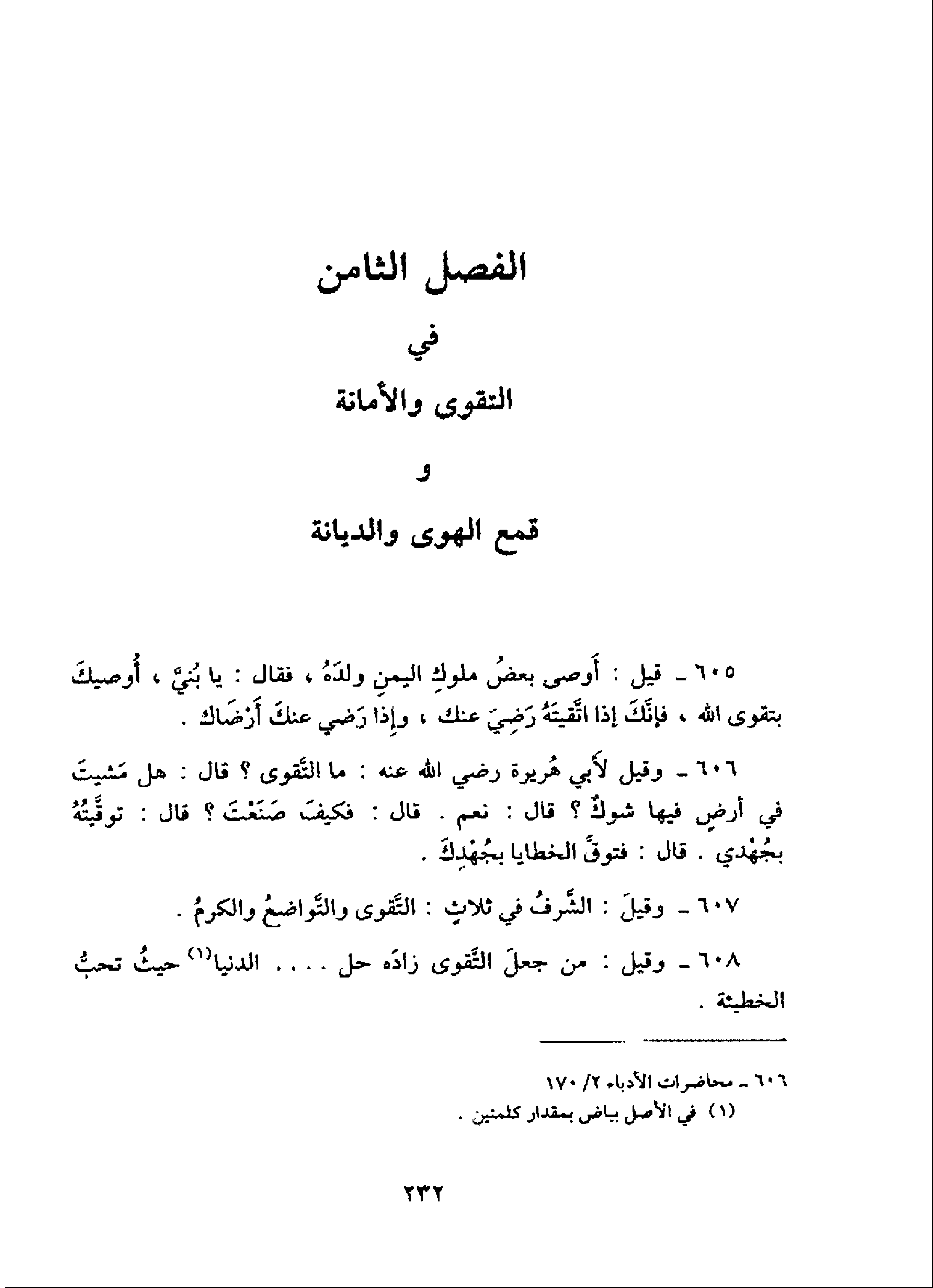 606 - وقيل لأبي هريرة رضي الله عنه: ما التّقوى؟ قال: هل مشيت في أرض فيها شوك؟ قال: نعم، قال: فكيف صنعت؟ قال: توقّيته بجهدي. قال: فتوقّ الخطايا بجهدك.