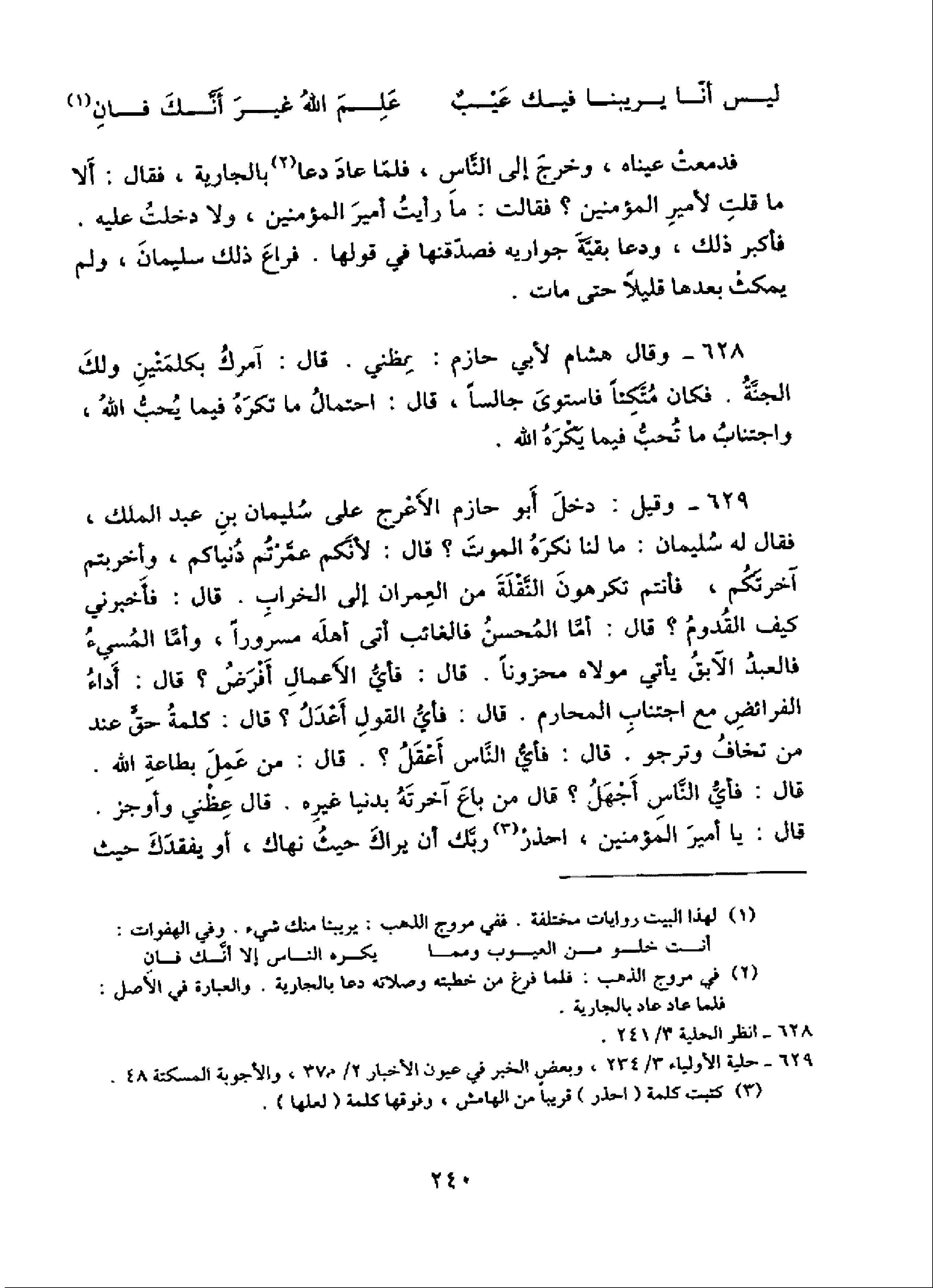 629 - حلية الأولياء 3/ 234، وبعض الخبر في عيون الأخبار 2/ 370، والأجوبة المسكتة 48.