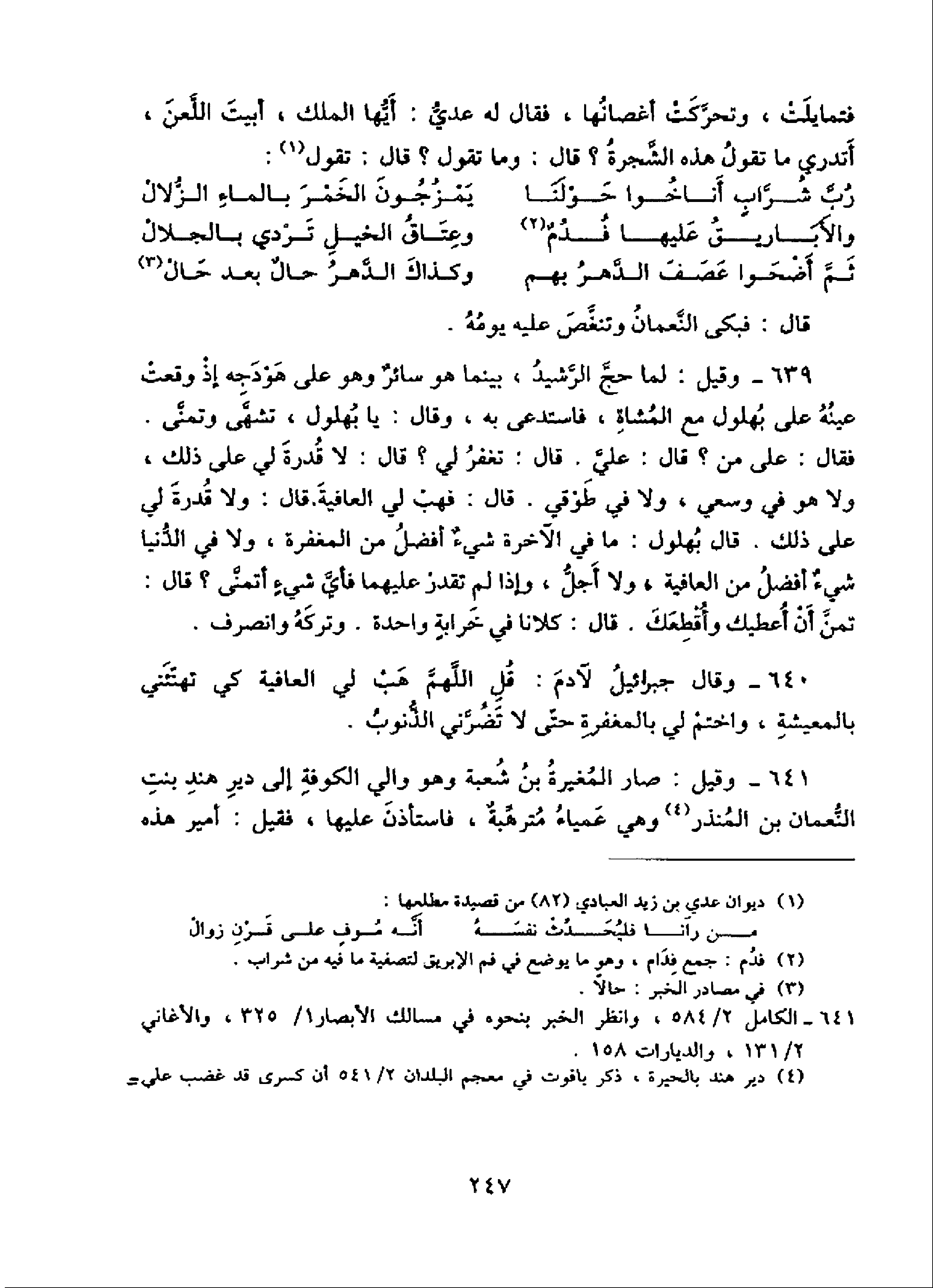 فتمايلت، وتحرّكت أغصانها، فقال له عديّ: أيّها الملك، أبيت اللّعن، أتدري ما تقول هذه الشّجرة؟ قال: وما تقول؟ قال: تقول (¬1):