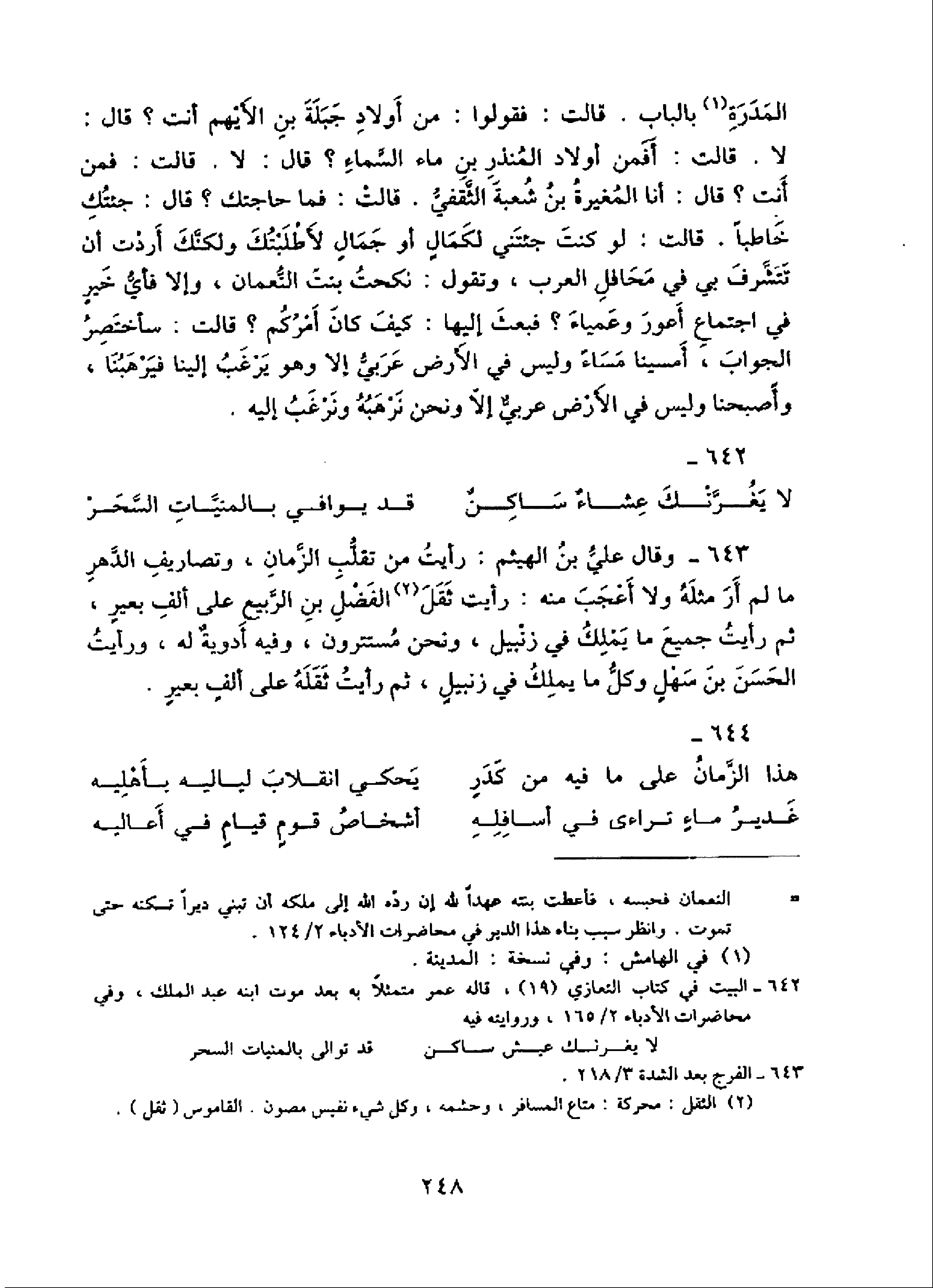 643 - وقال عليّ بن الهيثم: رأيت من تقلّب الزّمان، وتصاريف الدّهر ما لم أر مثله ولا أعجب منه: رأيت ثقل (¬2) الفضل بن الرّبيع على ألف بعير، ثم رأيت جميع ما يملك في زنبيل، ونحن مستترون، وفيه أدوية له، ورأيت الحسن بن سهل وكلّ ما يملك في زنبيل، ثم رأيت ثقله على ألف بعير.