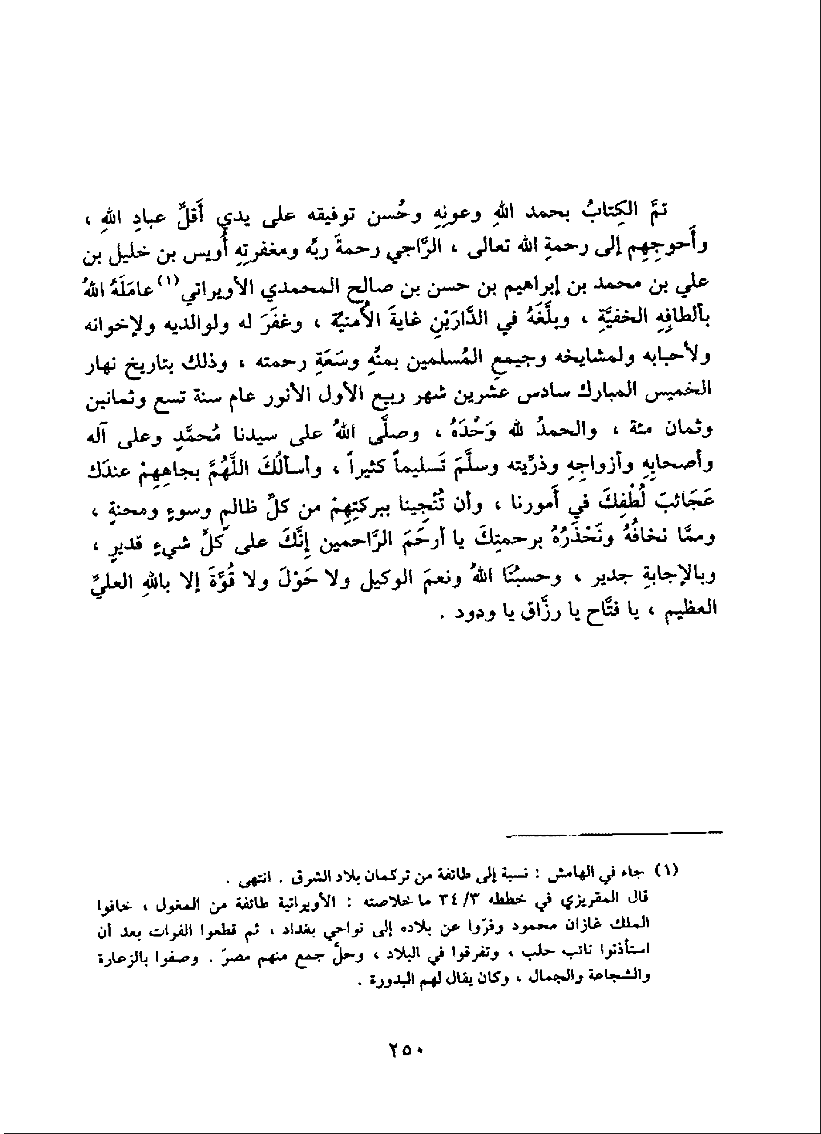 تمّ الكتاب بحمد الله وعونه وحسن توفيقه على يدي أقلّ عباد الله، وأحوجهم إلى رحمة الله تعالى، الرّاجي رحمة ربّه ومغفرته أويس بن خليل بن علي بن محمد بن إبراهيم بن حسن بن صالح المحمدي الأويراتي (¬1) عامله الله بألطافه الخفيّة، وبلّغه في الدّارين غاية الأمنيّة، وغفر له ولوالديه ولإخوانه ولأحبابه ولمشايخه وجميع المسلمين بمنّه وسعة رحمته، وذلك بتاريخ نهار الخميس المبارك سادس عشرين شهر ربيع الأول الأنور عام سنة تسع وثمانين وثمان مئة، والحمد لله وحده، وصلّى الله على سيدنا محمّد وعلى آله وأصحابه وأزواجه وذرّيته وسلّم تسليما كثيرا، وأسألك اللهمّ بجاههم عندك عجائب لطفك في أمورنا، وأن تنجينا ببركتهم من كلّ ظالم وسوء ومحنة، وممّا نخافه ونحذره برحمتك يا أرحم الرّاحمين إنّك على كلّ شيء قدير، وبالإجابة جدير، وحسبنا الله ونعم الوكيل ولا حول ولا قوّة إلا بالله العليّ العظيم، يا فتّاح يا رزّاق يا ودود.