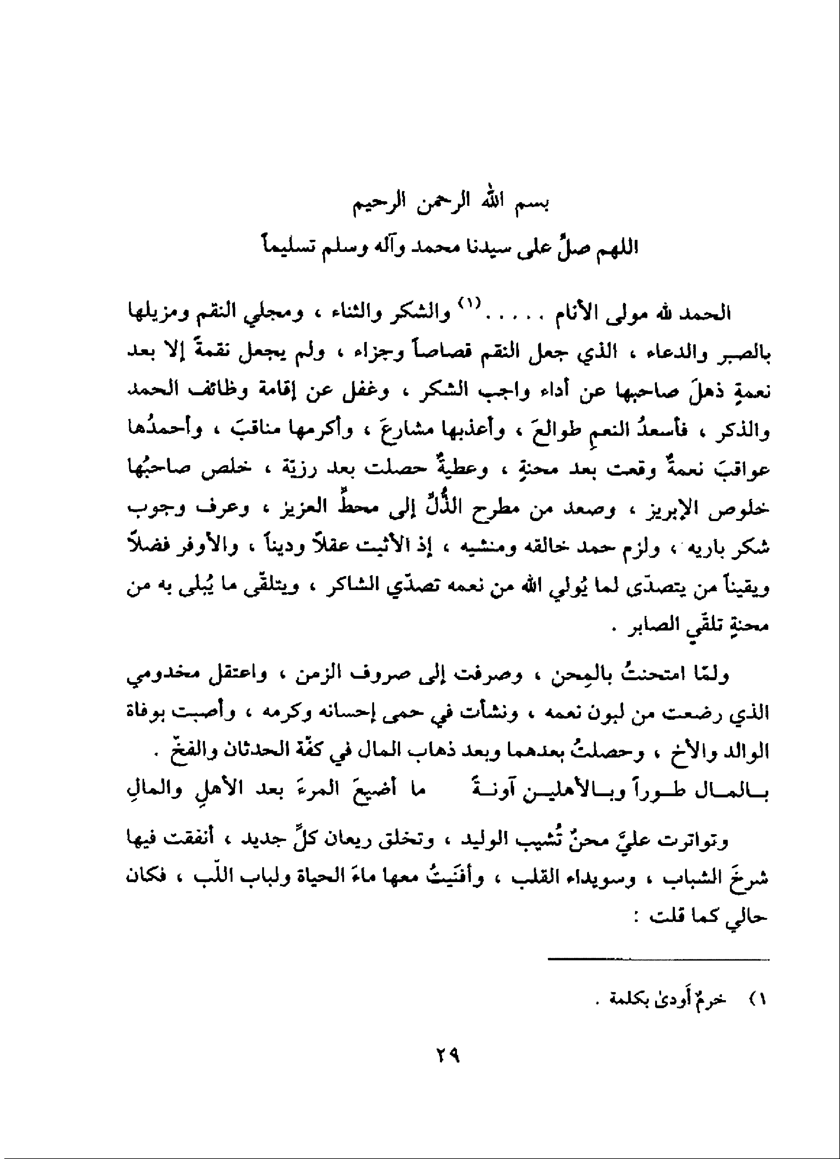 اللهم صلّ على سيدنا محمد وآله وسلم تسليما الحمد لله مولى الأنام. . . . . (¬1) والشكر والثناء، ومجلي النقم ومزيلها بالصبر والدعاء، الذي جعل النقم قصاصا وجزاء، ولم يجعل نقمة إلا بعد نعمة ذهل صاحبها عن أداء واجب الشكر، وغفل عن إقامة وظائف الحمد والذكر، فأسعد النعم طوالع، وأعذبها مشارع، وأكرمها مناقب، وأحمدها عواقب نعمة وقعت بعد محنة، وعطية حصلت بعد رزيّة، خلص صاحبها خلوص الإبريز، وصعد من مطرح الذّلّ إلى محطّ العزيز، وعرف وجوب شكر باريه، ولزم حمد خالقه ومنشيه، إذ الأثبت عقلا ودينا، والأوفر فضلا ويقينا من يتصدّى لما يولي الله من نعمه تصدّي الشاكر، ويتلقّى ما يبلى به من محنة تلقّي الصابر.