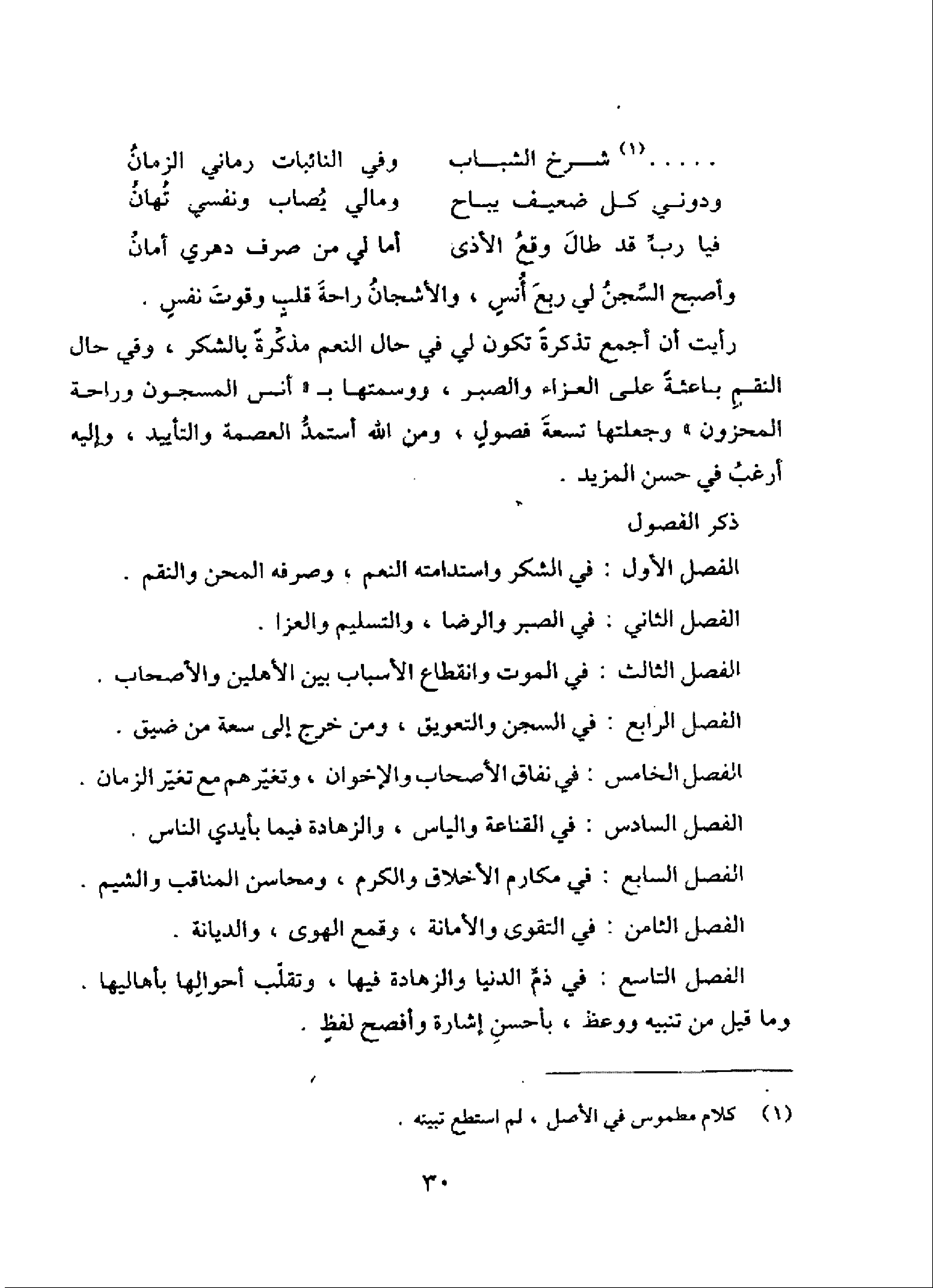 رأيت أن أجمع تذكرة تكون لي في حال النعم مذكرّة بالشكر، وفي حال النقم باعثة على العزاء والصبر، ووسمتها ب «أنس المسجون وراحة المحزون» وجعلتها تسعة فصول، ومن الله أستمدّ العصمة والتأييد، وإليه أرغب في حسن المزيد.