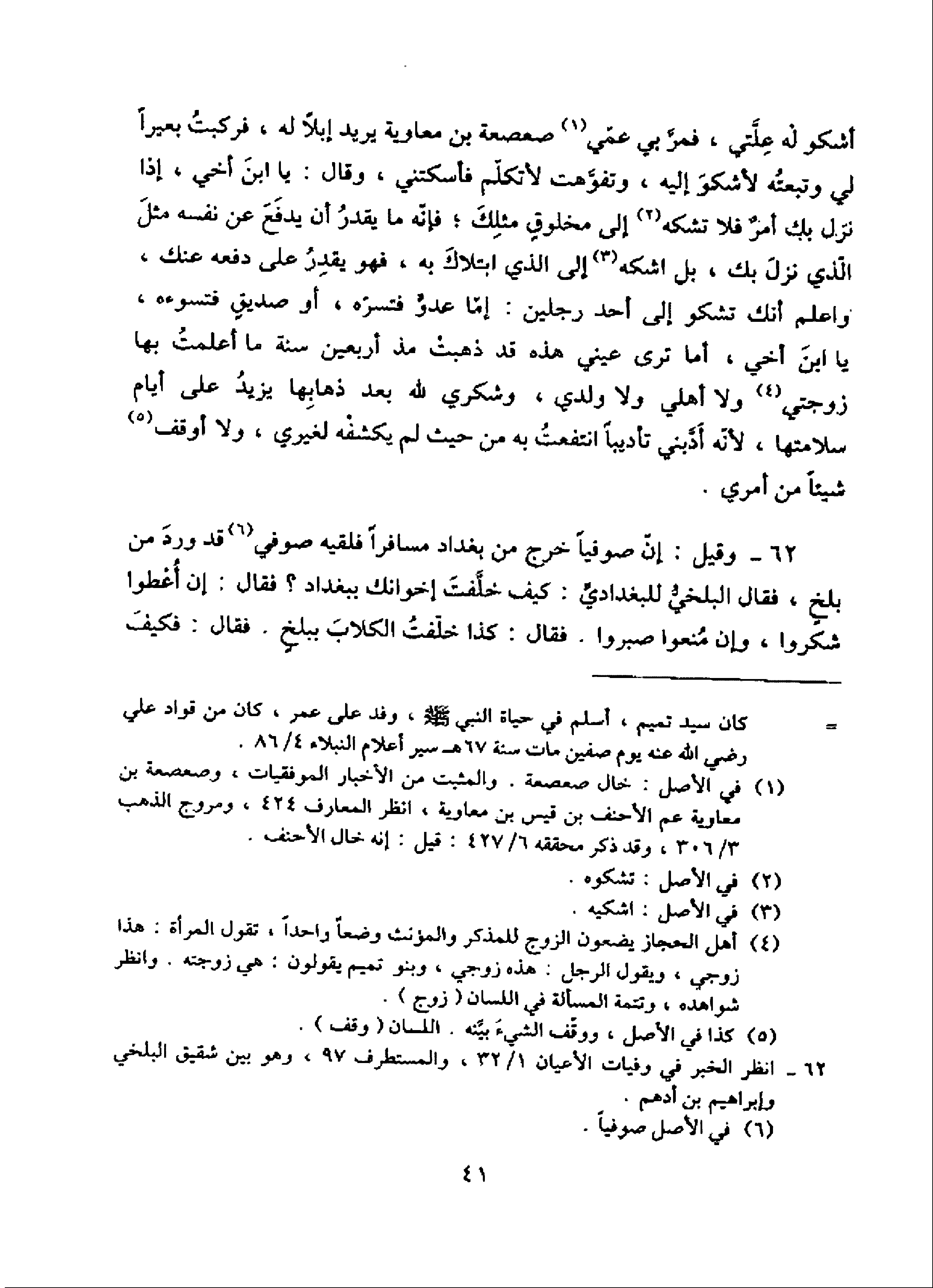 62 - انظر الخبر في وفيات الأعيان 1/ 32، والمستطرف 97، وهو بين شقيق البلخي وإبراهيم بن أدهم.