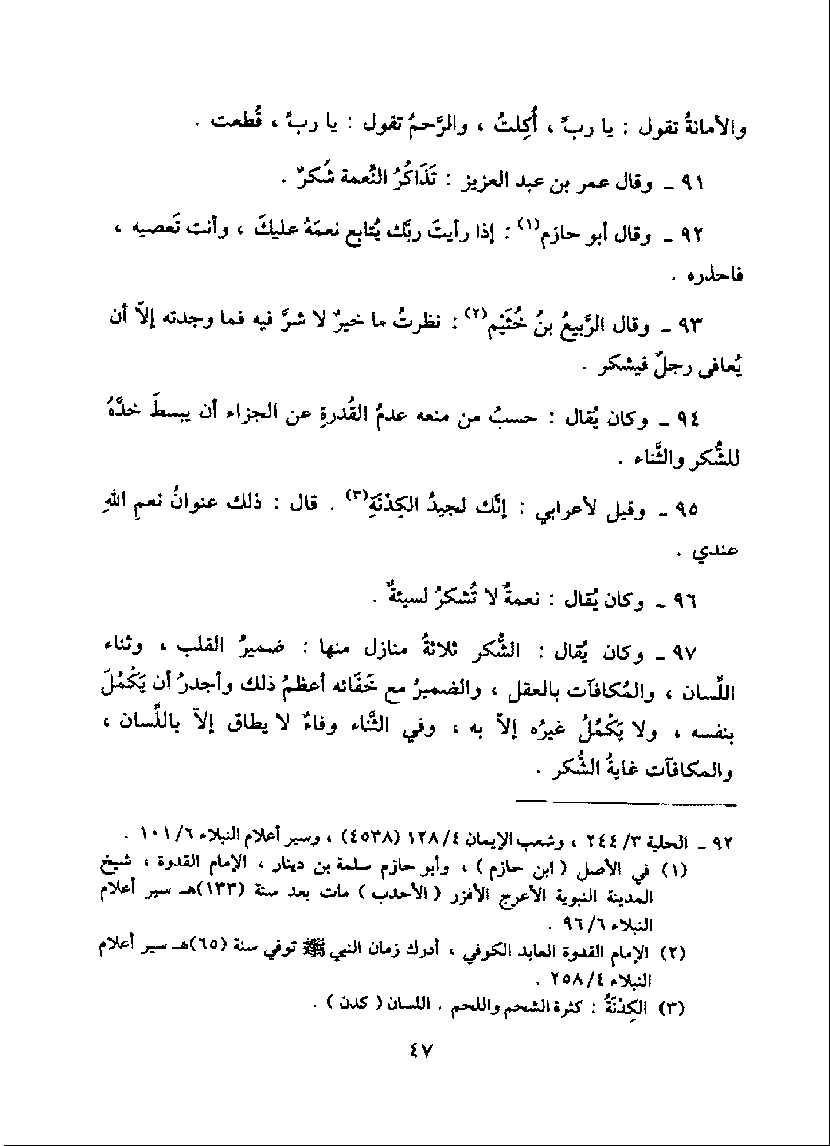 91 - وقال عمر بن عبد العزيز: تذاكر النّعمة شكر.