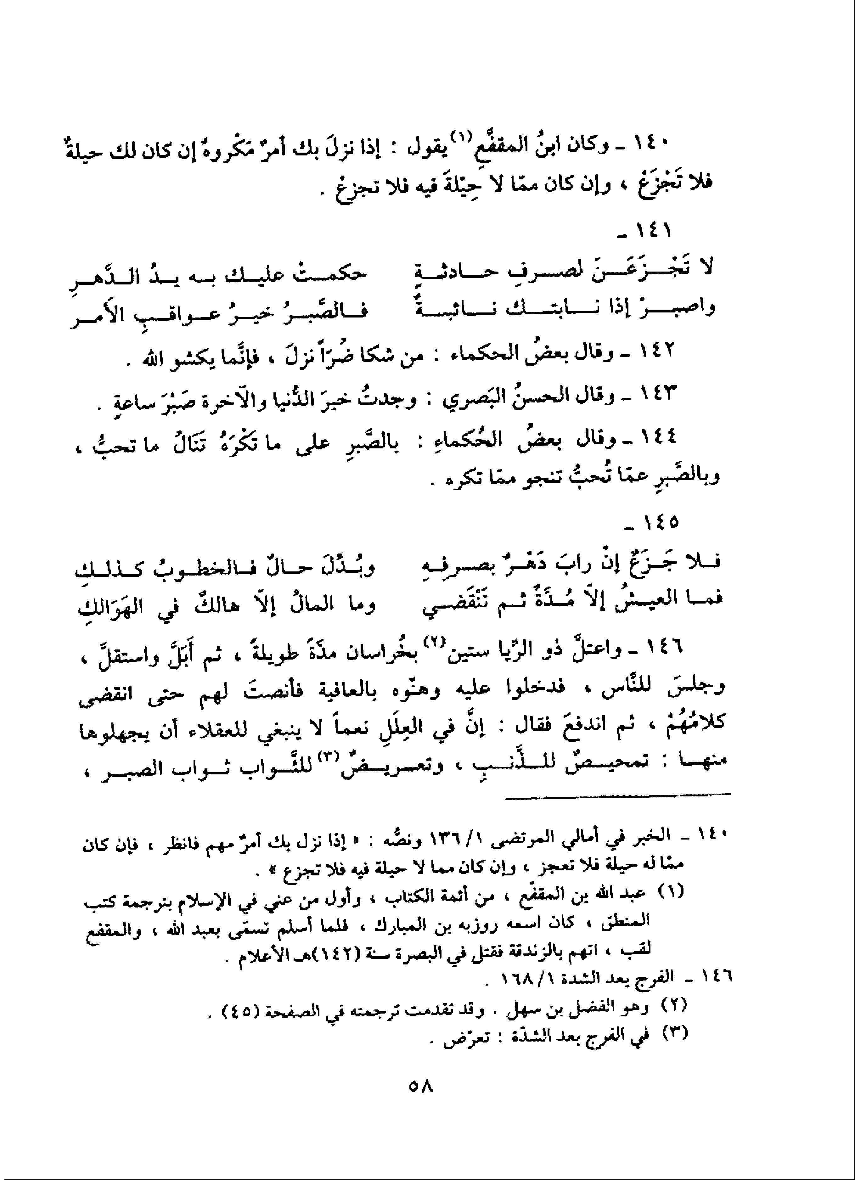 140 - وكان ابن المقفّع (¬1) يقول: إذا نزل بك أمر مكروه إن كان لك حيلة فلا تجزع، وإن كان ممّا لا حيلة فيه فلا تجزع.