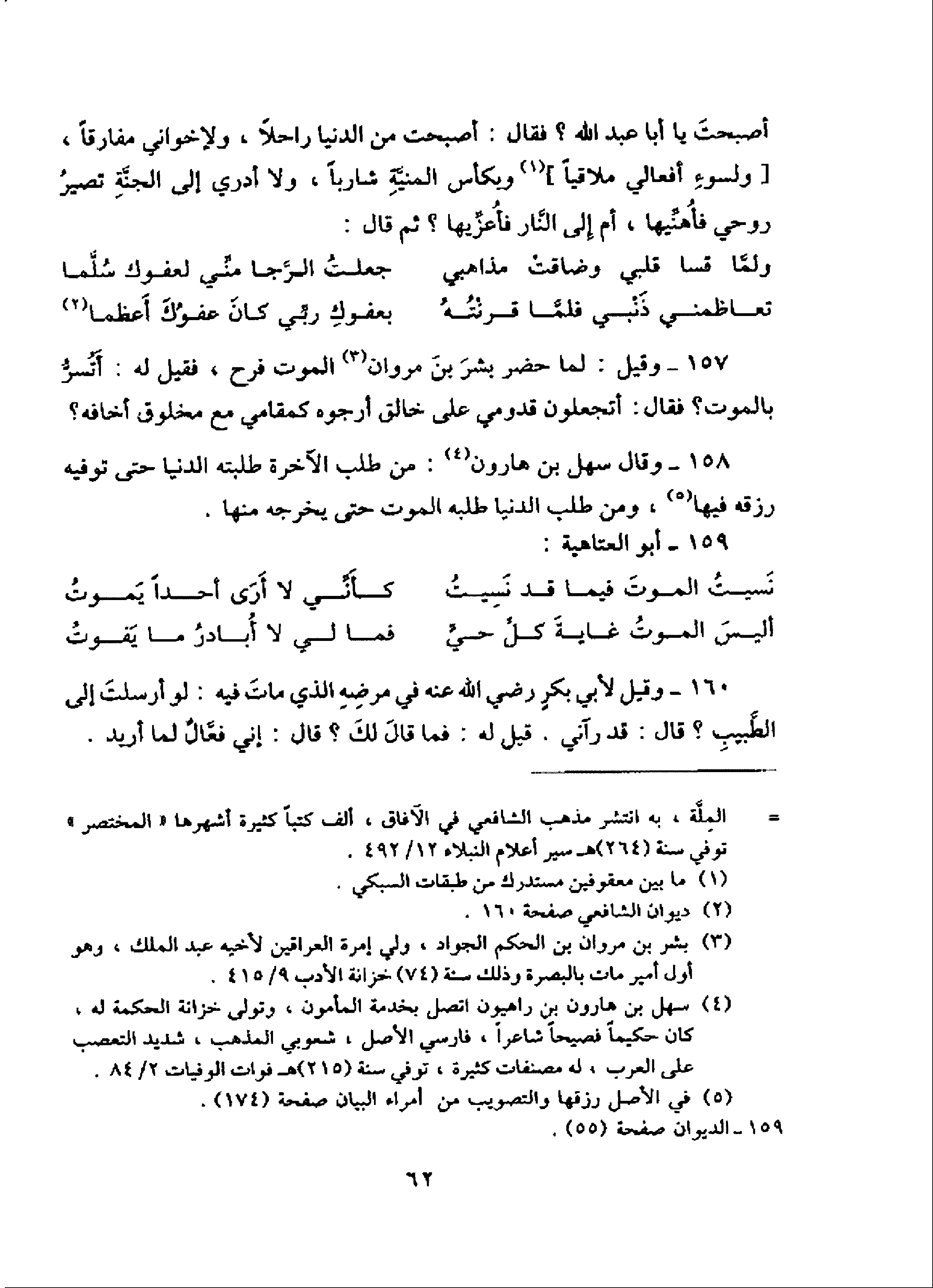 157 - وقيل: لما حضر بشر بن مروان (¬3) الموت فرح، فقيل له: أتسرّ بالموت؟ فقال: أتجعلون قدومي على خالق أرجوه كمقامي مع مخلوق أخافه؟