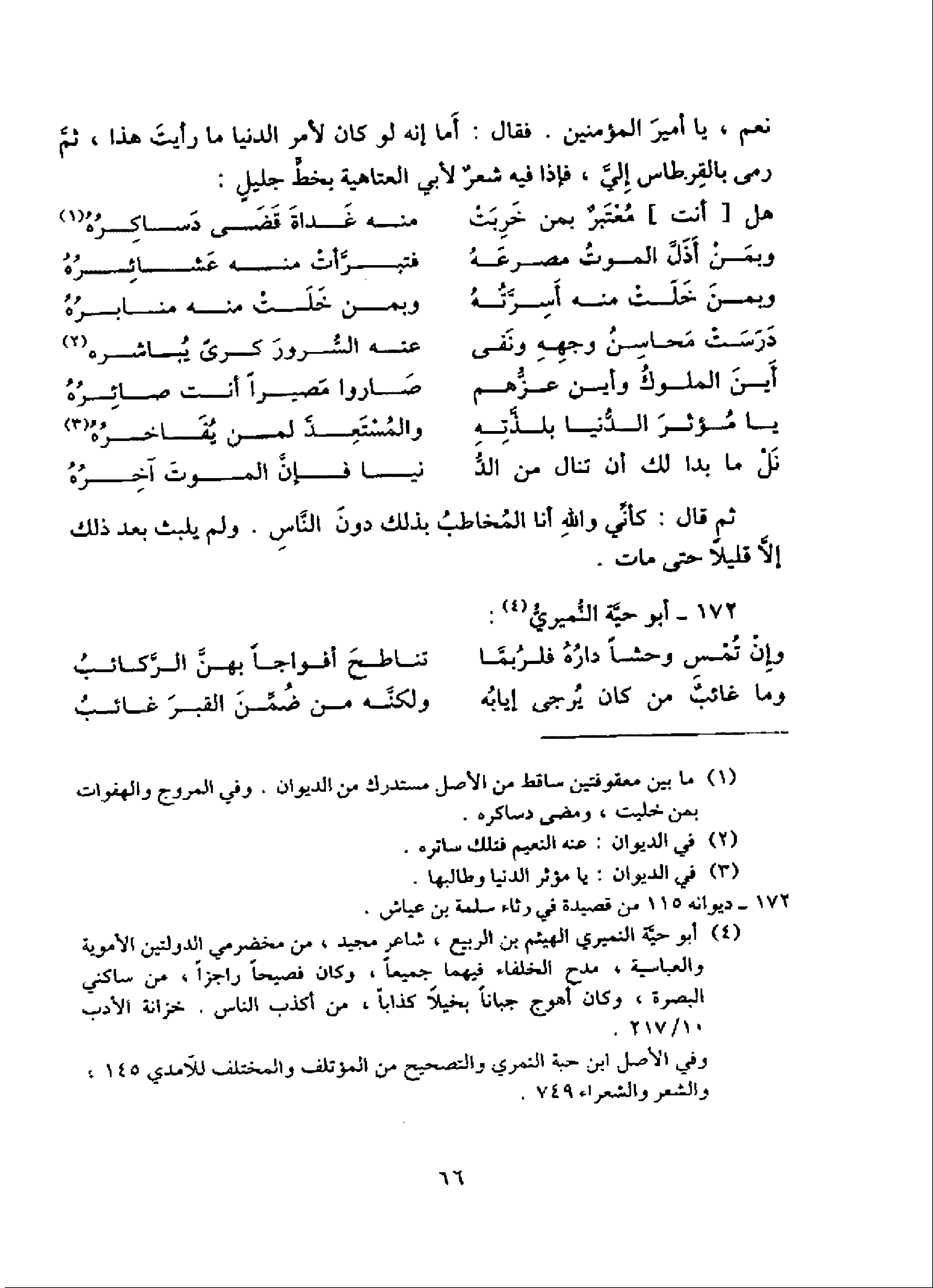 (¬4) أبو حيّة النميري الهيثم بن الربيع، شاعر مجيد، من مخضرمي الدولتين الأموية والعباسية، مدح الخلفاء فيهما جميعا، وكان فصيحا راجزا، من ساكني البصرة، وكان أهوج جبانا بخيلا كذابا، من أكذب الناس. خزانة الأدب 10/ 217. وفي الأصل ابن حبة النمري والتصحيح من المؤتلف والمختلف للآمدي 145، والشعر والشعراء 749.