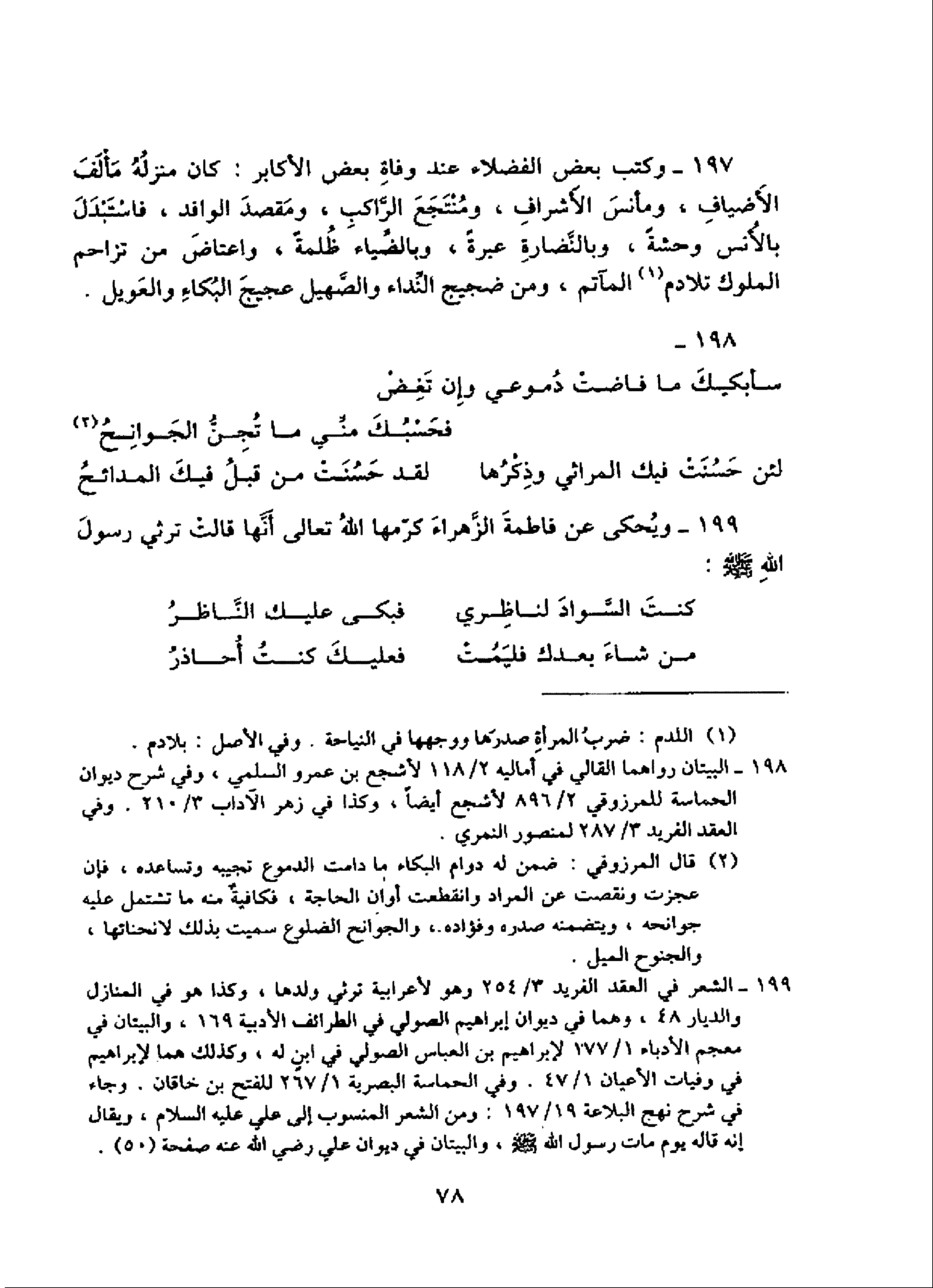 199 - الشعر في العقد الفريد 3/ 254 وهو لأعرابية ترثي ولدها، وكذا هو في المنازل والديار 48، وهما في ديوان إبراهيم الصولي في الطرائف الأدبية 169، والبيتان في معجم الأدباء 1/ 177 لإبراهيم بن العباس الصولي في ابن له، وكذلك هما لإبراهيم في وفيات الأعيان 1/ 47. وفي الحماسة البصرية 1/ 267 للفتح بن خاقان. وجاء في شرح نهج البلاغة 19/ 197: ومن الشعر المنسوب إلى علي عليه السلام، ويقال إنه قاله يوم مات رسول الله صلّى الله عليه وسلّم، والبيتان في ديوان علي رضي الله عنه صفحة (50).