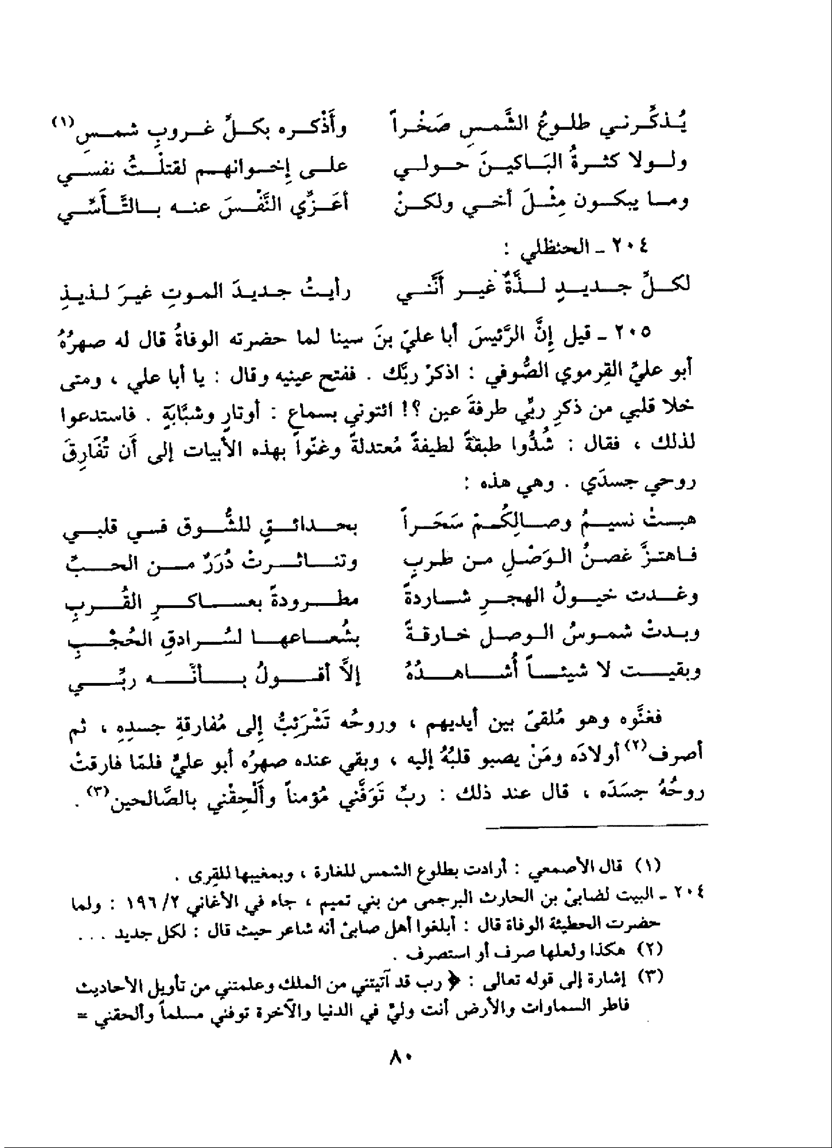 205 - قيل إنّ الرّئيس أبا عليّ بن سينا لما حضرته الوفاة قال له صهره أبو عليّ القرموي الصّوفي: اذكر ربّك. ففتح عينيه وقال: يا أبا علي، ومتى خلا قلبي من ذكر ربّي طرفة عين؟! ائتوني بسماع: أوتار وشبّابة. فاستدعوا لذلك، فقال: شدّوا طبقة لطيفة معتدلة وغنّوا بهذه الأبيات إلى أن تفارق روحي جسدي. وهي هذه: