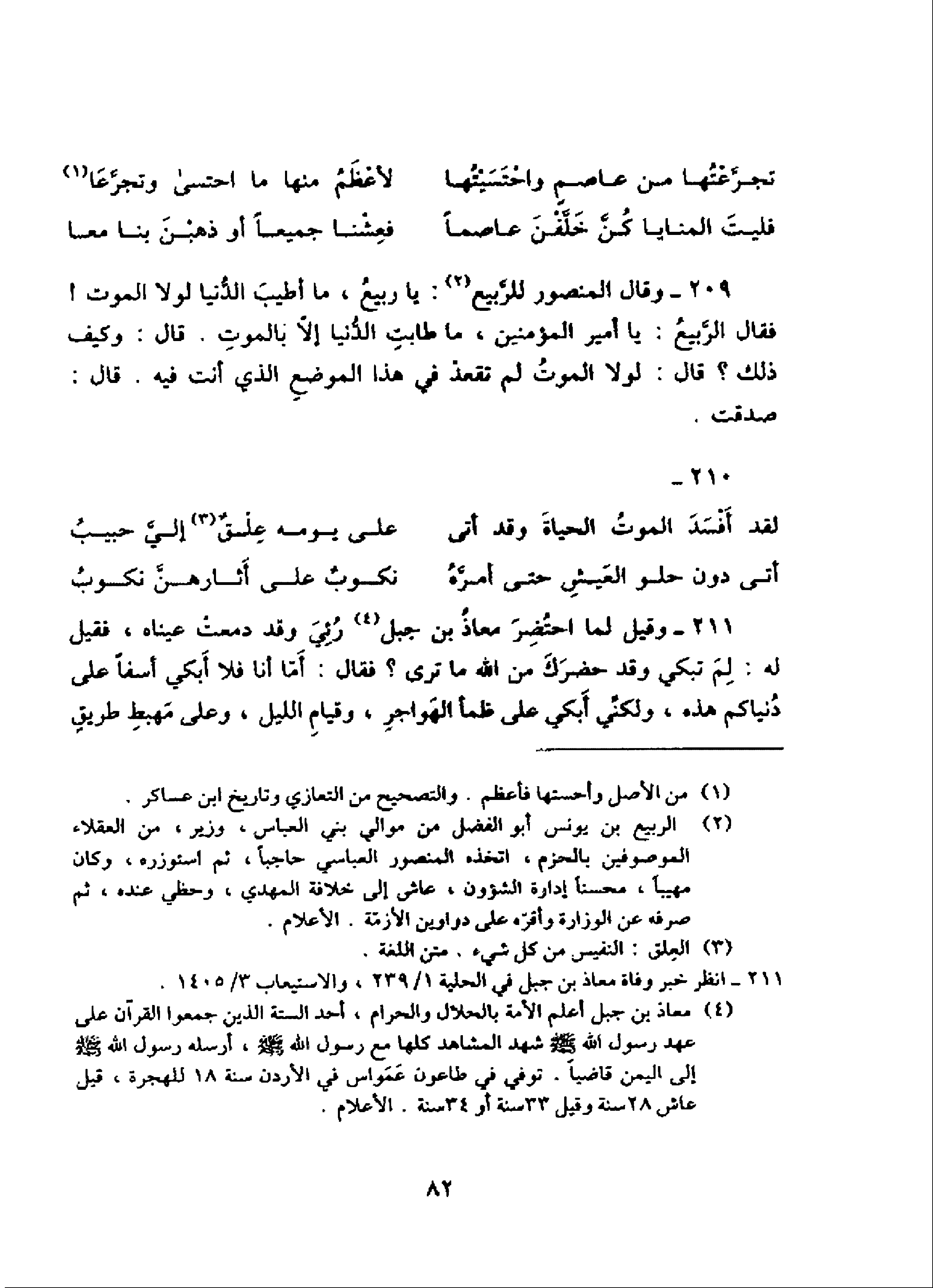 209 - وقال المنصور للرّبيع (¬2): يا ربيع، ما أطيب الدّنيا لولا الموت! فقال الرّبيع: يا أمير المؤمنين، ما طابت الدّنيا إلاّ بالموت. قال: وكيف ذلك؟ قال: لولا الموت لم تقعد في هذا الموضع الذي أنت فيه. قال: