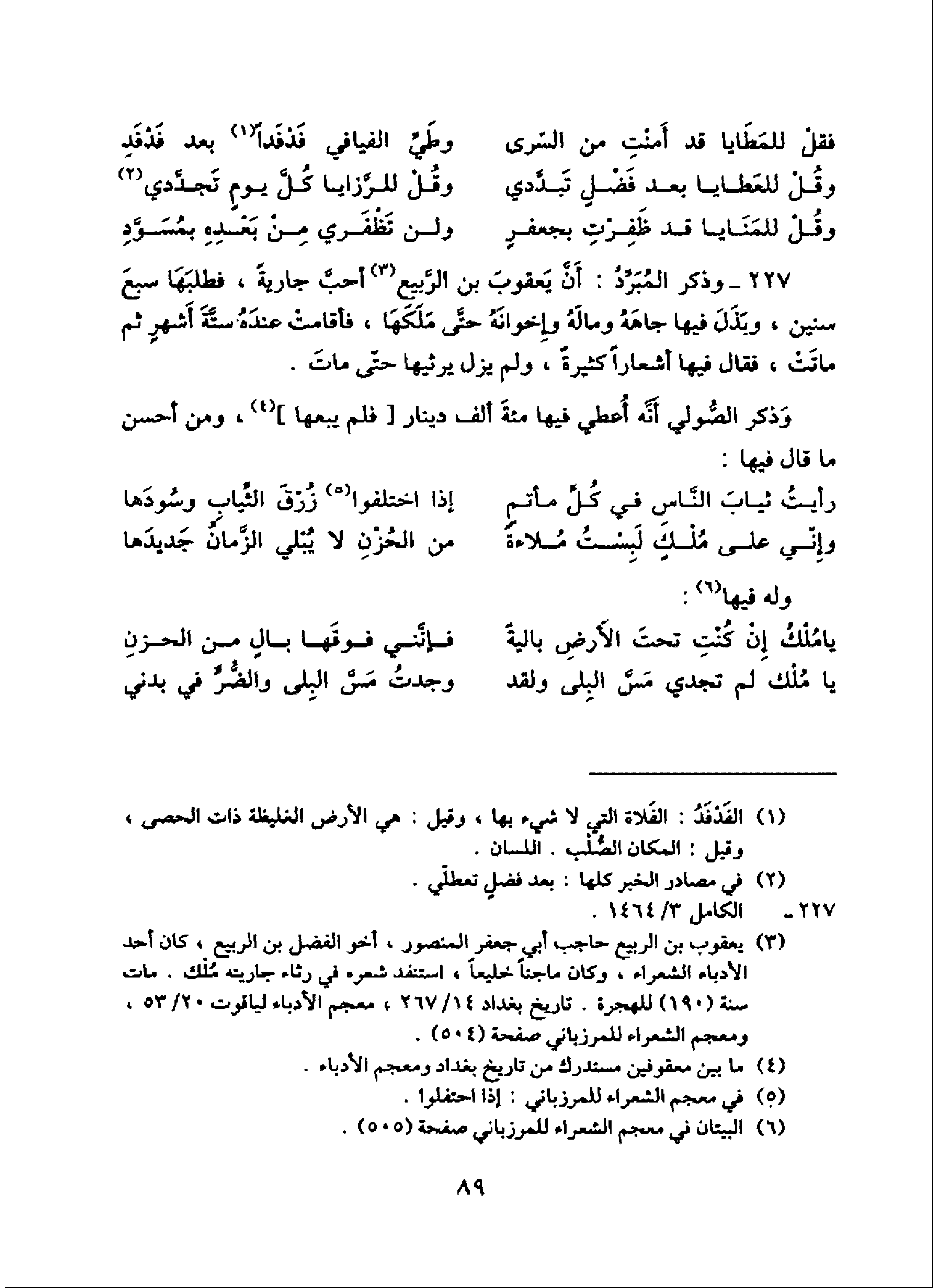 227 - وذكر المبرّد: أنّ يعقوب بن الرّبيع (¬3) أحبّ جارية، فطلبها سبع سنين، وبذل فيها جاهه وماله وإخوانه حتّى ملكها، فأقامت عنده ستّة أشهر ثم ماتت، فقال فيها أشعارا كثيرة، ولم يزل يرثيها حتّى مات.