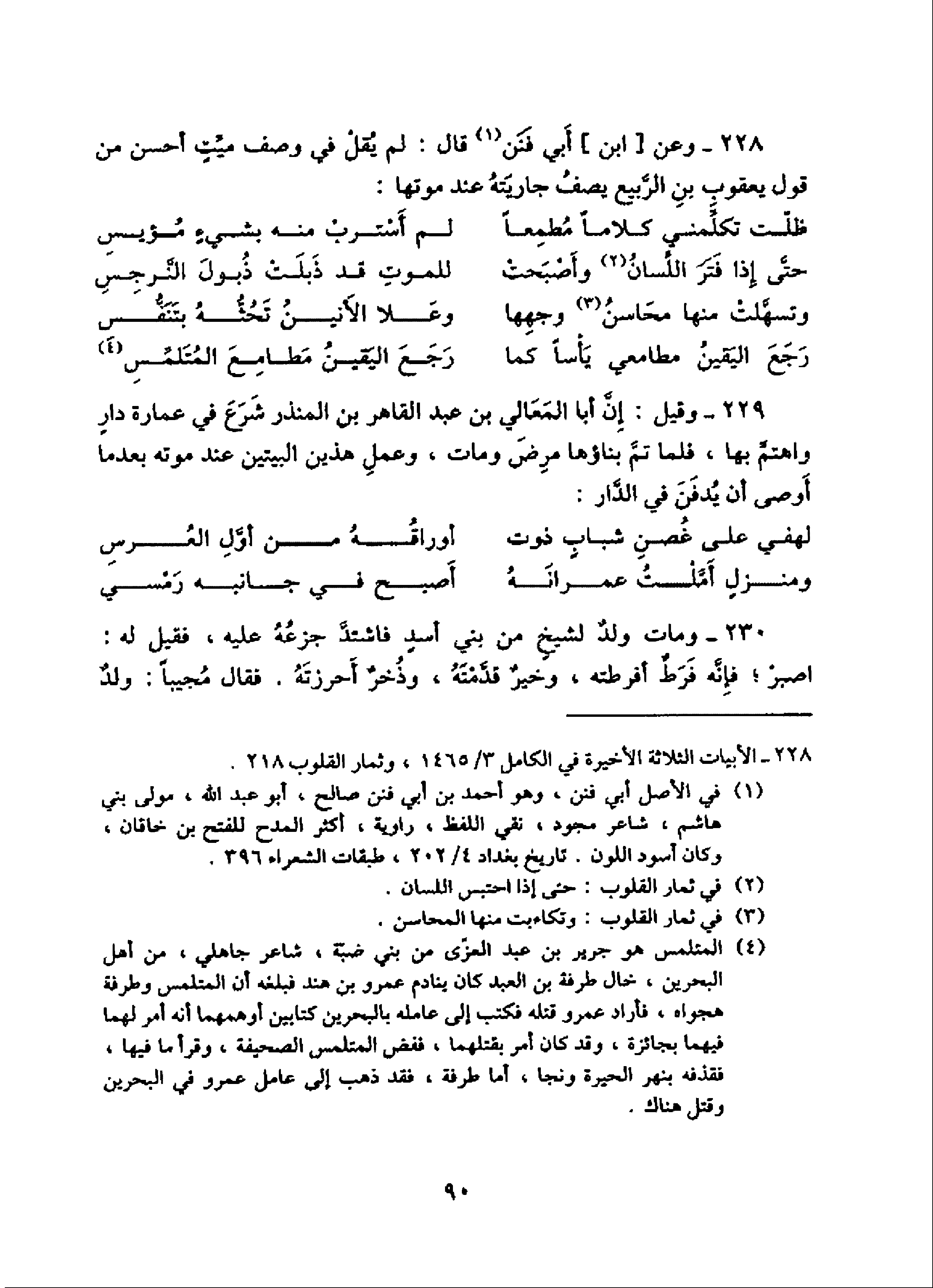 228 - الأبيات الثلاثة الأخيرة في الكامل 3/ 1465، وثمار القلوب 218.