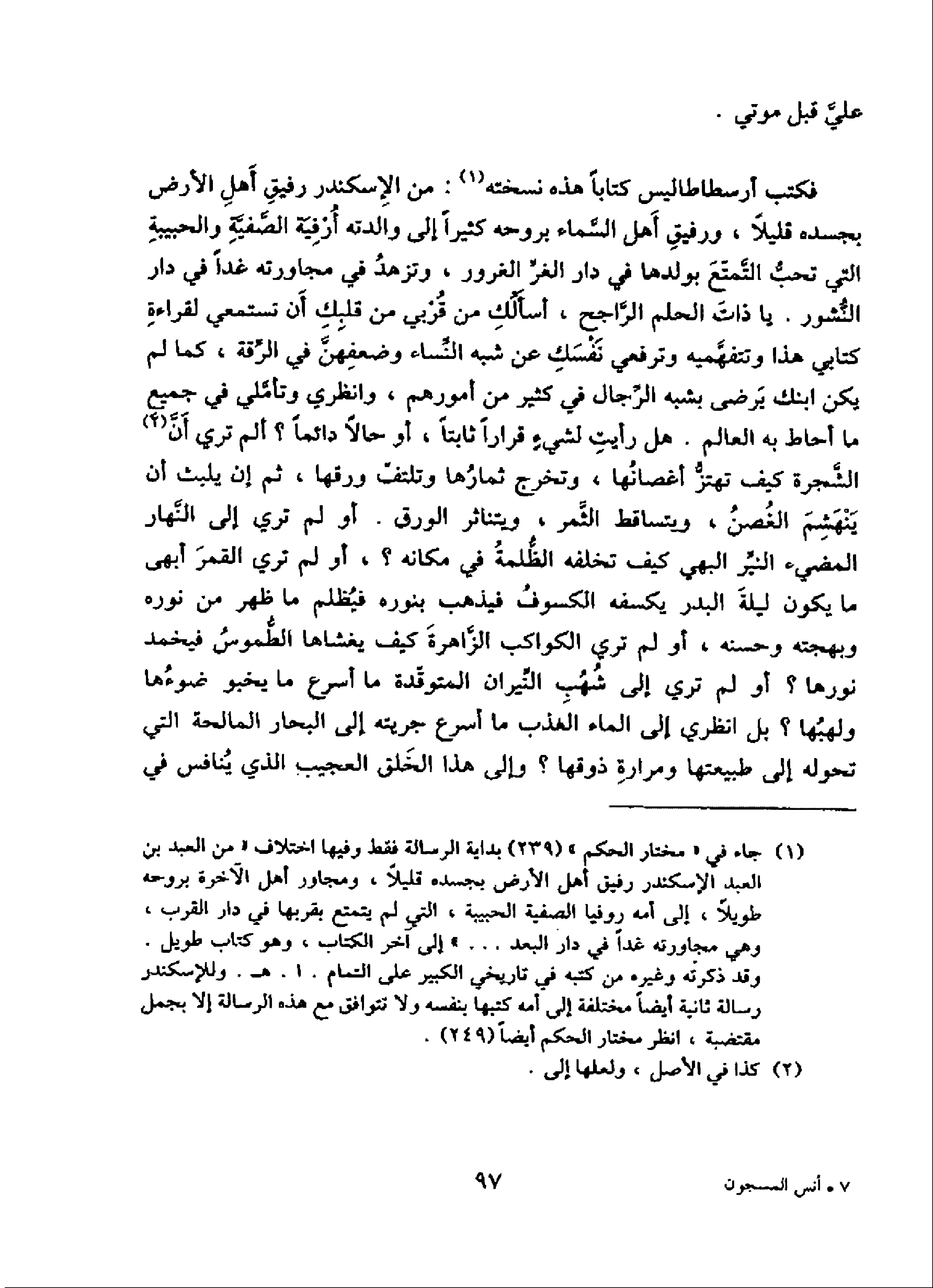 (¬1) جاء في «مختار الحكم» (239) بداية الرسالة فقط وفيها اختلاف «من العبد بن العبد الإسكندر رفيق أهل الأرض بجسده قليلا، ومجاور أهل الآخرة بروحه طويلا، إلى أمه روفيا الصفية الحبيبة، التي لم يتمتع بقربها في دار القرب، وهي مجاورته غدا في دار البعد. . .» إلى آخر الكتاب، وهو كتاب طويل. وقد ذكرته وغيره من كتبه في تاريخي الكبير على التمام. ا. هـ. وللإسكندر رسالة ثانية أيضا مختلفة إلى أمه كتبها بنفسه ولا تتوافق مع هذه الرسالة إلا بجمل مقتضبة، انظر مختار الحكم أيضا (249).