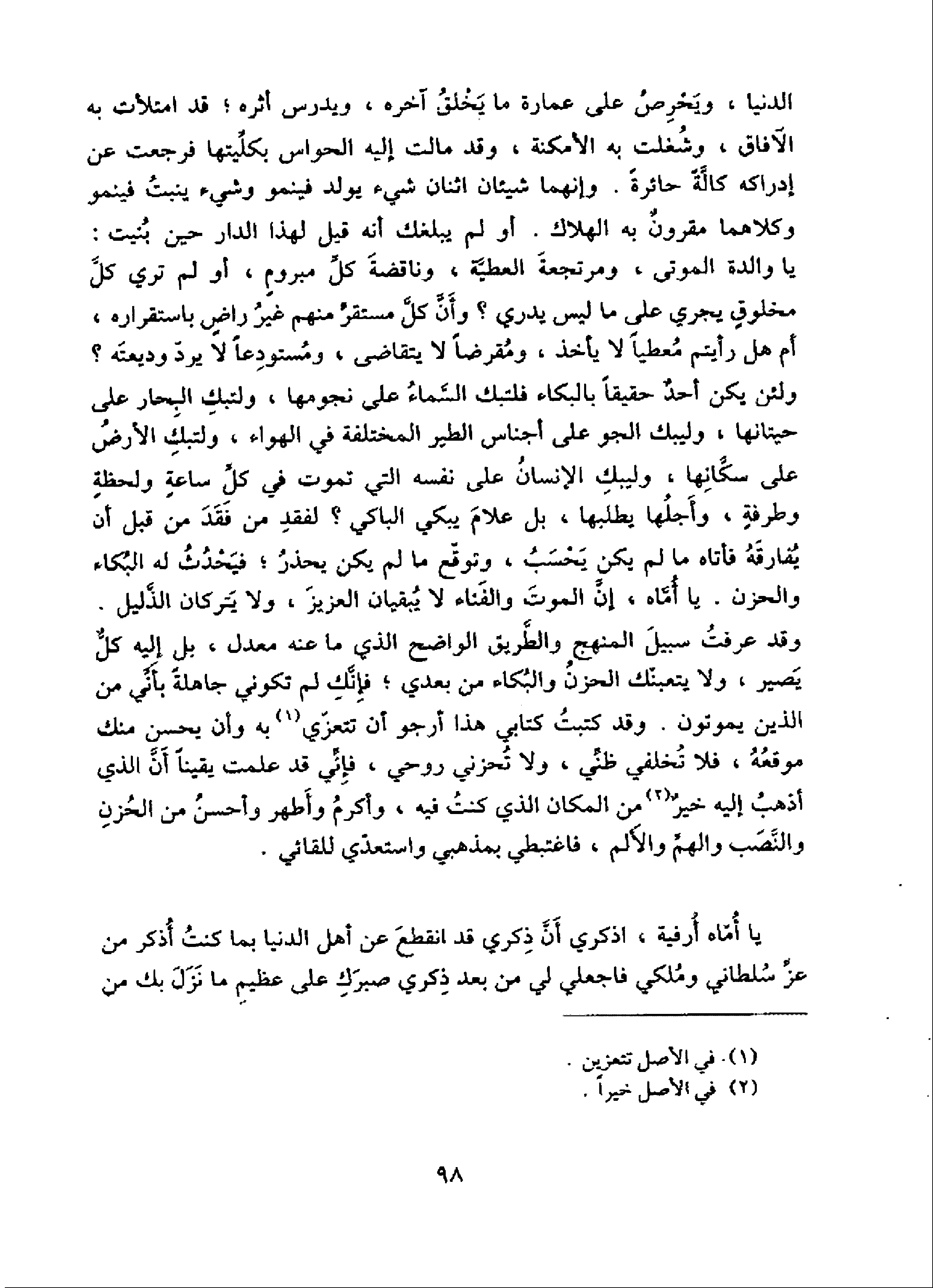 يا والدة الموتى، ومرتجعة العطيّة، وناقضة كلّ مبروم، أو لم تري كلّ مخلوق يجري على ما ليس يدري؟ وأنّ كلّ مستقرّ منهم غير راض باستقراره، أم هل رأيتم معطيا لا يأخذ، ومقرضا لا يتقاضى، ومستودعا لا يردّ وديعته؟ ولئن يكن أحد حقيقا بالبكاء فلتبك السّماء على نجومها، ولتبك البحار على حيتانها، وليبك الجو على أجناس الطير المختلفة في الهواء، ولتبك الأرض على سكّانها، وليبك الإنسان على نفسه التي تموت في كلّ ساعة ولحظة وطرفة، وأجلها يطلبها، بل علام يبكي الباكي؟ لفقد من فقد من قبل أن يفارقه فأتاه ما لم يكن يحسب، وتوقّع ما لم يكن يحذر؛ فيحدث له البكاء والحزن. يا أمّاه، إنّ الموت والفناء لا يبقيان العزيز، ولا يتركان الذّليل.