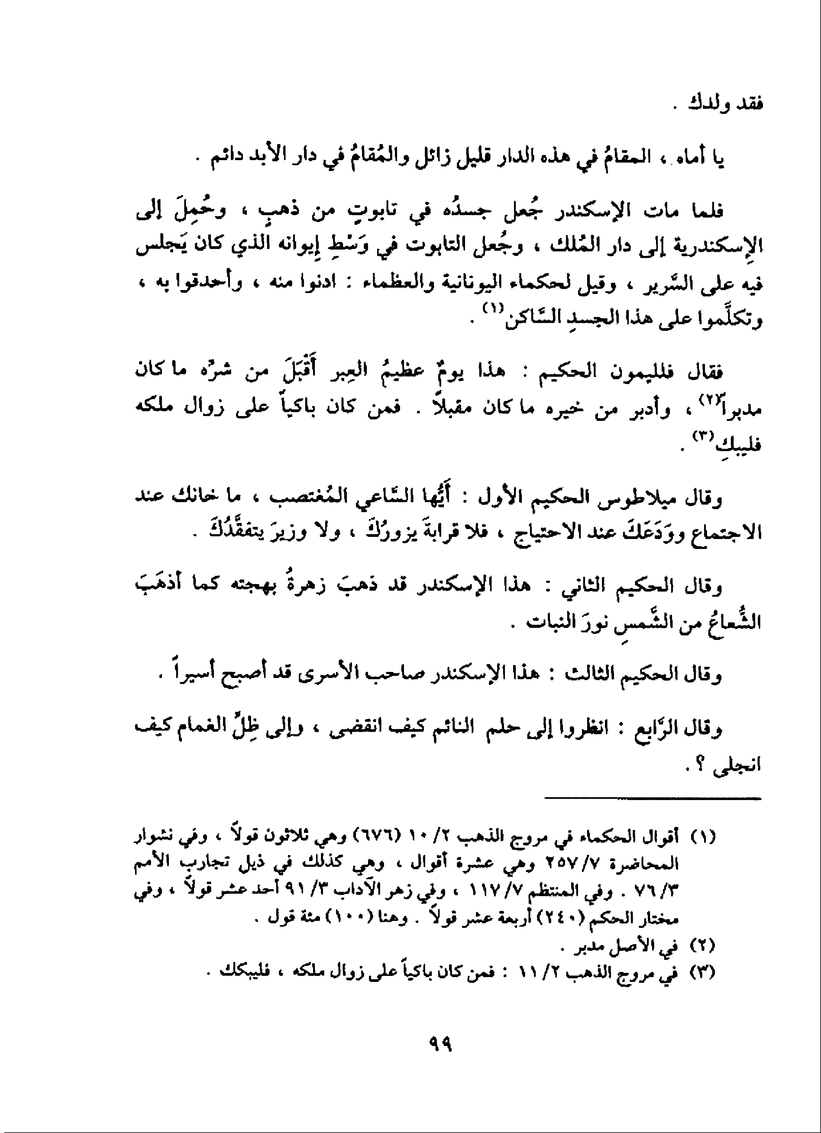 (¬1) أقوال الحكماء في مروج الذهب 2/ 10 (676) وهي ثلاثون قولا، وفي نشوار المحاضرة 7/ 257 وهي عشرة أقوال، وهي كذلك في ذيل تجارب الأمم 3/ 76. وفي المنتظم 7/ 117، وفي زهر الآداب 3/ 91 أحد عشر قولا، وفي مختار الحكم (240) أربعة عشر قولا. وهنا (100) مئة قول.