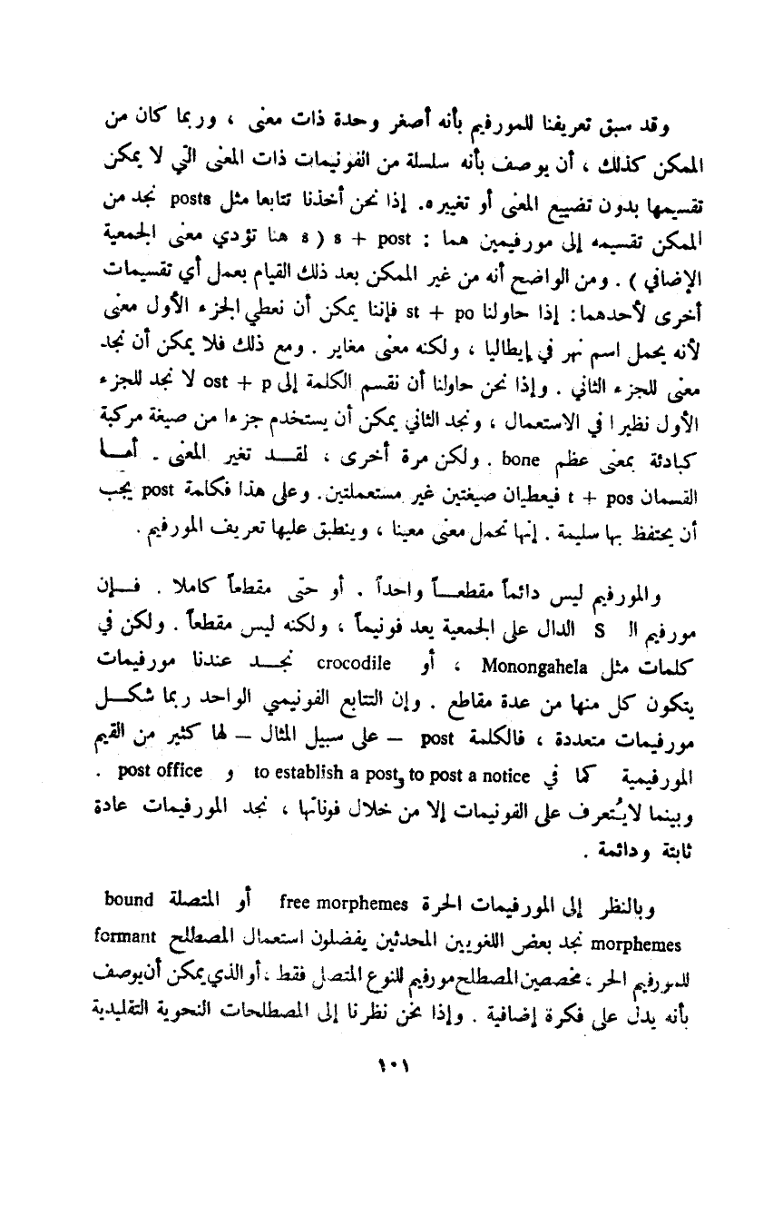 وقد سبق تعريفنا للمورفيم بأنه أصغر وحدة ذات معنى، وربما كان من الممكن كذلك، أن يوصف بأنه سلسلة من الفونيمات ذات المعنى التي لا يمكن تقسيمها بدون تضييع المعنى أو تغييره، إذا نحن أخذنا تتابعًا مثل posta نجد من الممكن تقسيمه إلى مورفيمين هما: s+post؛ "s هنا تؤدي معنى الجمعية الإضافي". ومن الواضح أنه من غير الممكن بعد ذلك القيام بعمل أي تقسيمات أخرى لأحدهما: إذا حاولنا st+po فإننا يمكن أن نعطي الجزء الأول معنى لأنه يحمل اسم نهر في إيطاليا، ولكنه معنى مغاير. ومع ذلك فلا يمكن أن نجد معنى للجزء الثاني. وإذا نحن حاولنا أن نقسم الكلمة إلى ost+p لا نجد للجزء الأول نظيرًا في الاستعمال، ونجد الثاني يمكن أن يستخدم جزءًا من صيغة مركبة كبادئة بمعنى عظم bone. ولكن مرة أخرى، لقد تغير المعنى. أما القسمان t+pos فيعطيان صيغتين غير مستعملتين. وعلى هذا فكلمة post يجب أن يحتفظ بها سليمة. إنها تحمل معنى معينًا، وينطبق عليها تعريف المورفيم.