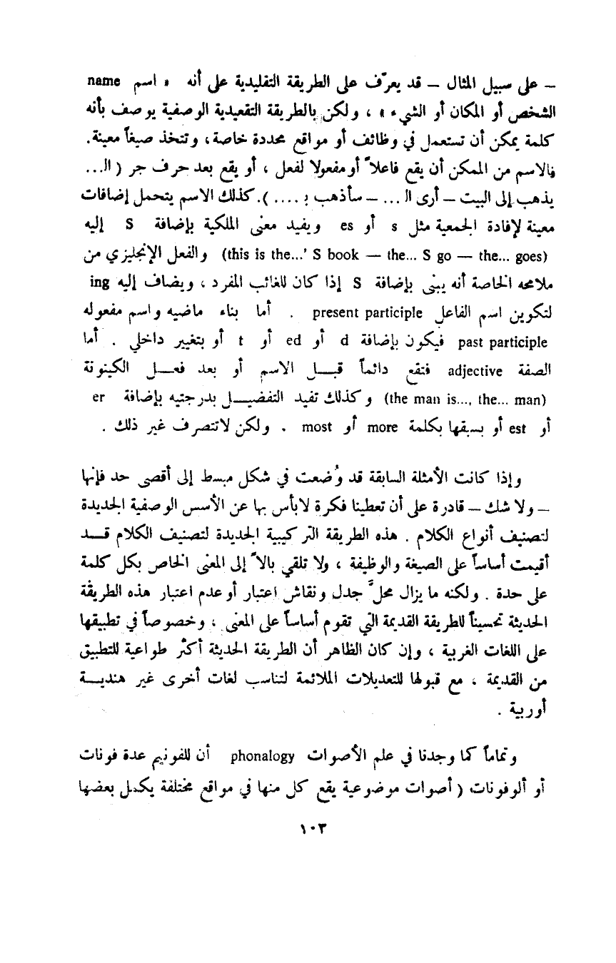 وإذا كانت الأمثلة السابقة قد وضعت في شكل مبسط إلى أقصى حد فإنها -ولا شك- قادرة على أن تعطينا فكرة لا بأس بها عن الأسس الوصفية الجديدة لتصنيف أنواع الكلام. هذه الطريقة التركيبية الجديدة لتصنيف الكلام قد أقيمت أساسًا على الصيغة والوظيفة، ولا تلقي بالا إلى المعنى الخاص بكل كلمة على حدة. ولكنه ما يزال محل جدل ونقاش اعتبار أو عدم اعتبار هذه الطريقة الحديثة تحسينًا للطريقة القديمة التي تقوم أساسًا على المعنى، وخصوصًا في تطبيقها على اللغات الغربية، وإن كان الظاهر أن الطريقة الحديثة أكثر طواعية للتطبيق من القديمة، مع قبولها للتعديلات الملائمة لتناسب لغات أخرى غير هندية أوربية.
